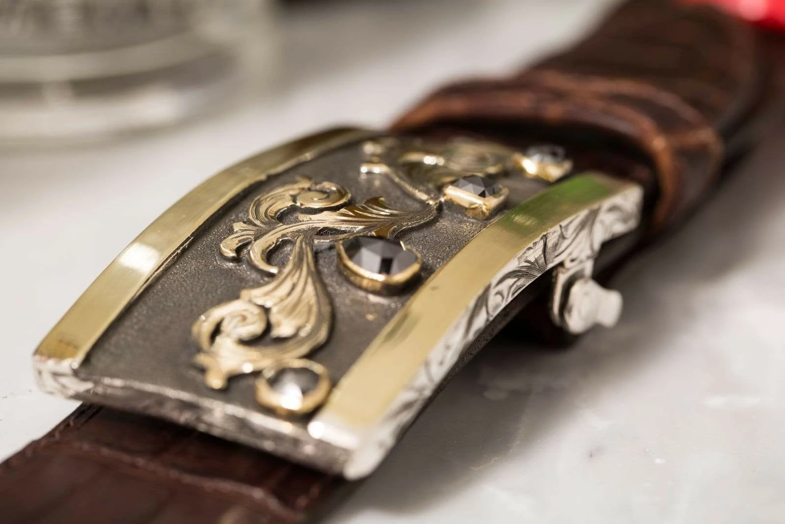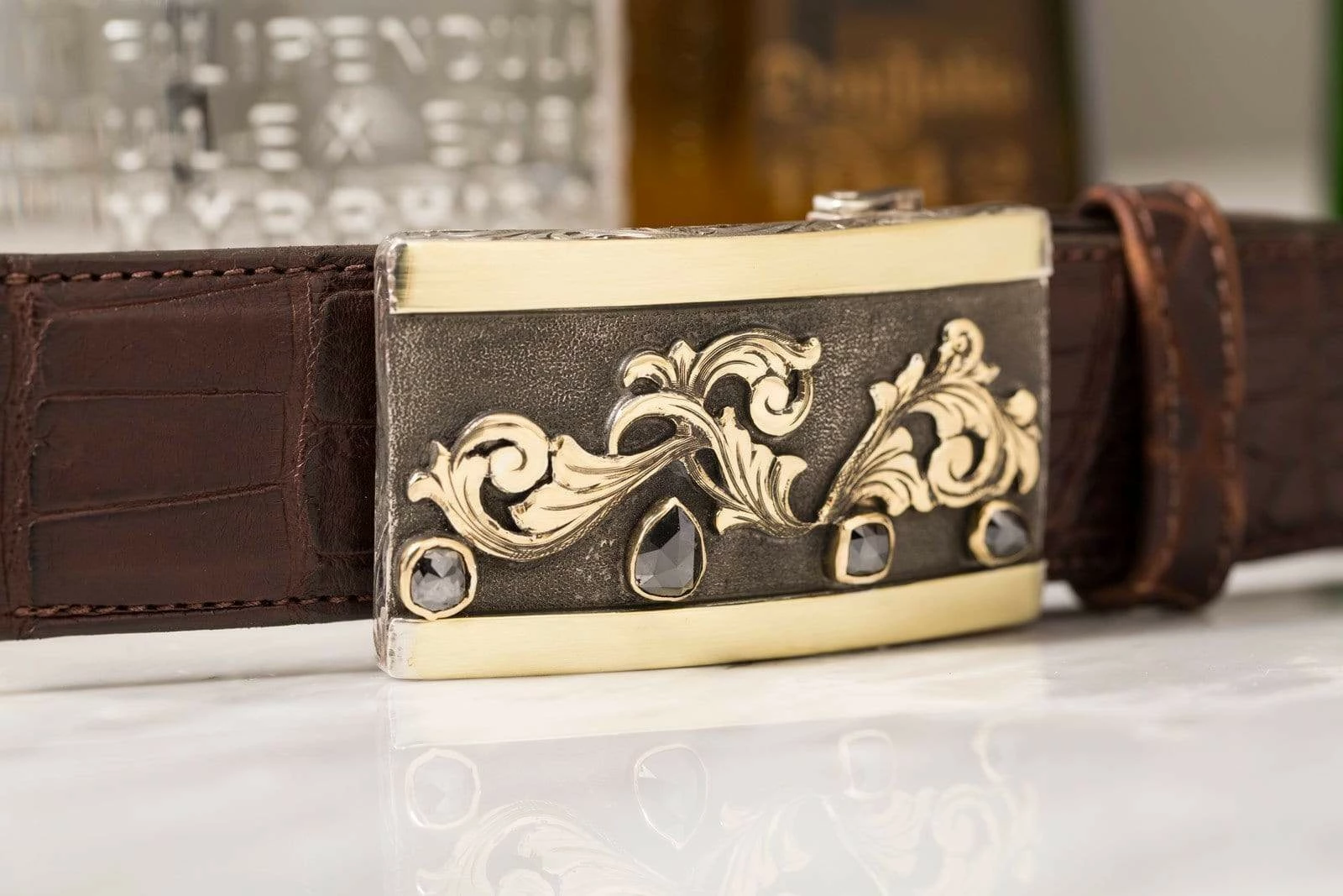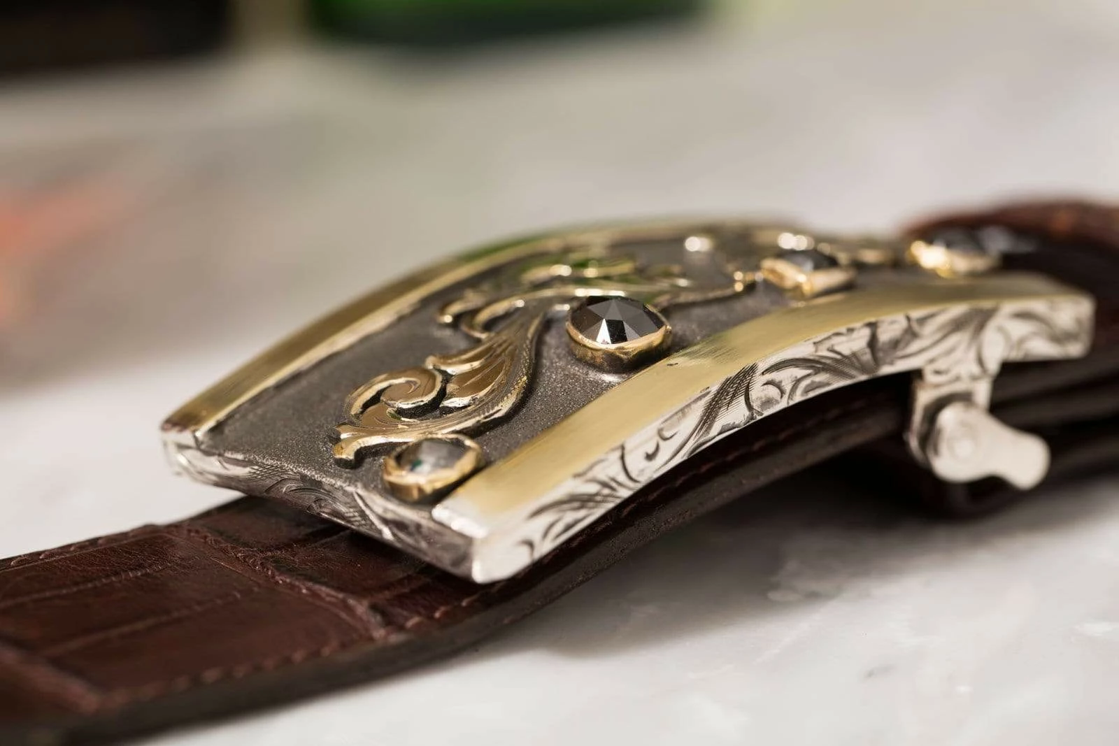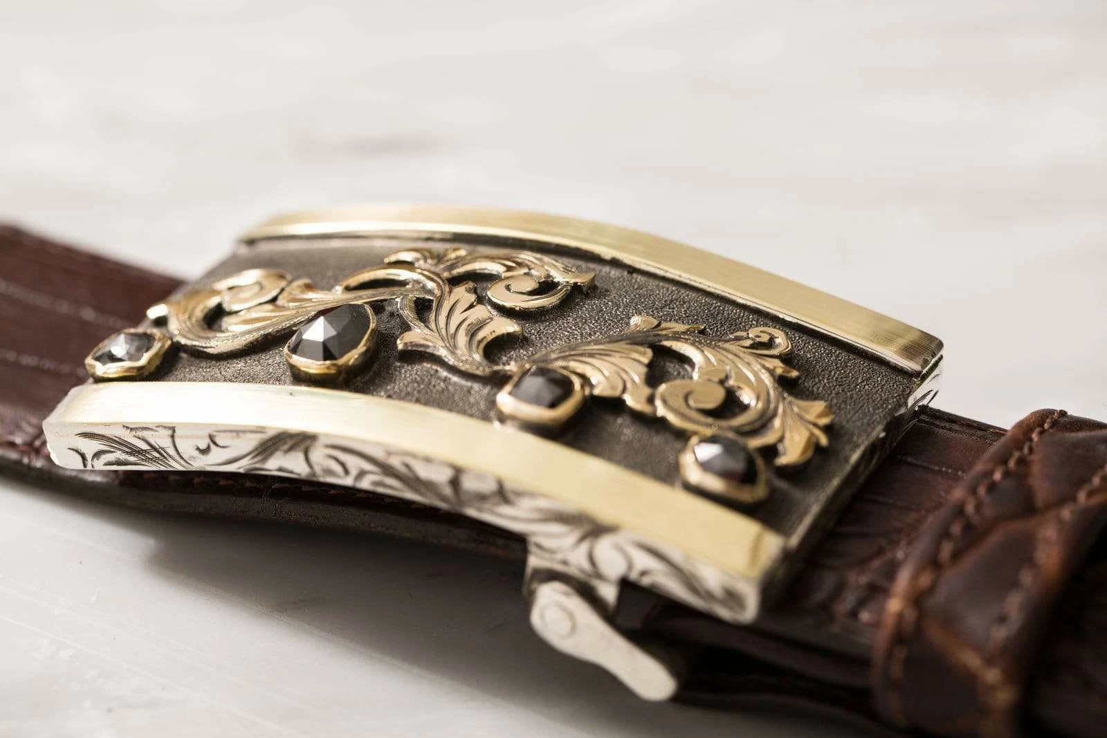 The Mason Bellini buckle by Comstock Heritage features four black diamonds (7.69ct) set in 18k yellow gold bezels below 18k yellow gold scrollwork, delicately restrained in Italianate style. Lightly brushed bars of 18k green gold form borders to the top and bottom, their rich color deepening the palette to welcome the prominent black diamonds, which otherwise may have set off too strongly against a backdrop of only darkened silver and lustrous yellow gold. The buckle itself has a surprising heft, offering a pleasing aesthetic dimension of weight to correspond with the solid borders and darkly indelicate diamonds. Handmade to fit all 1.5 inch belt straps.