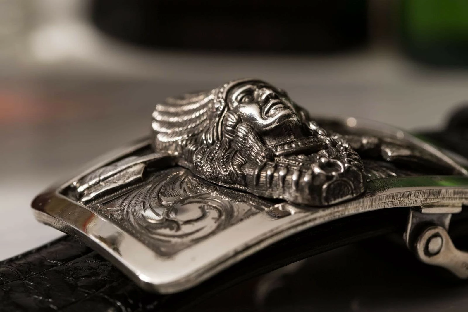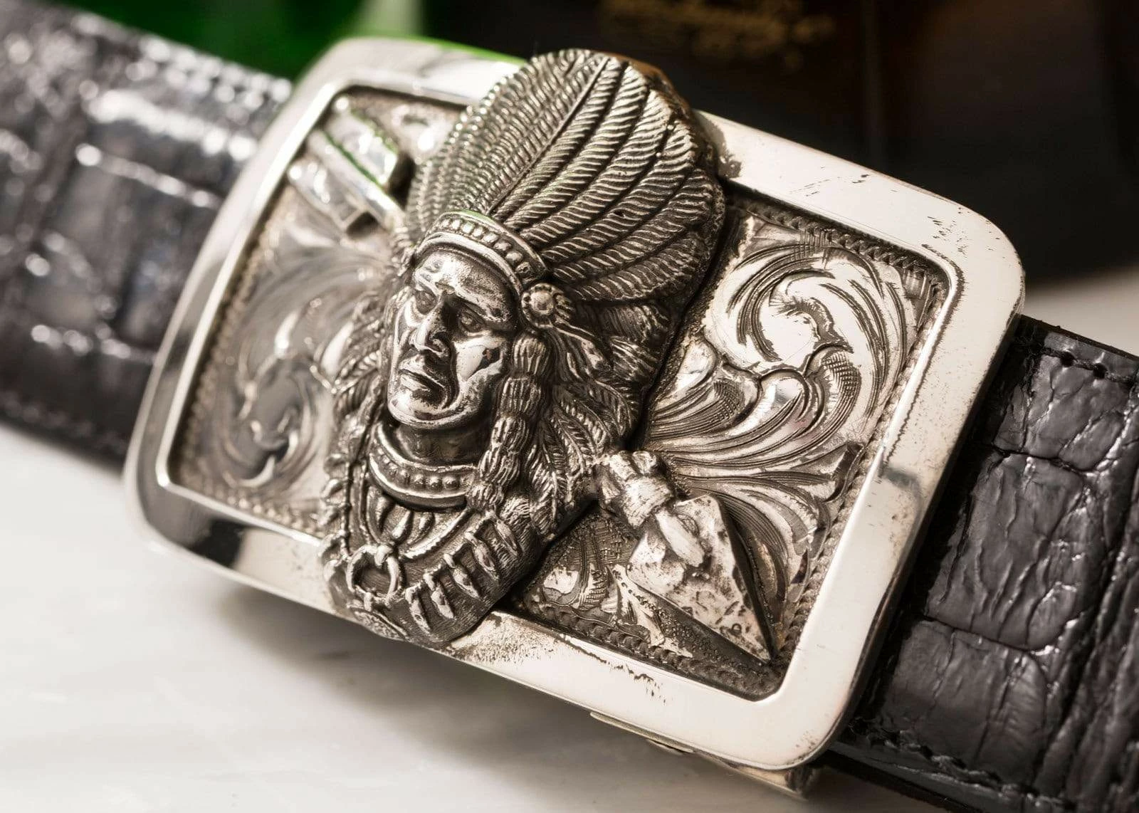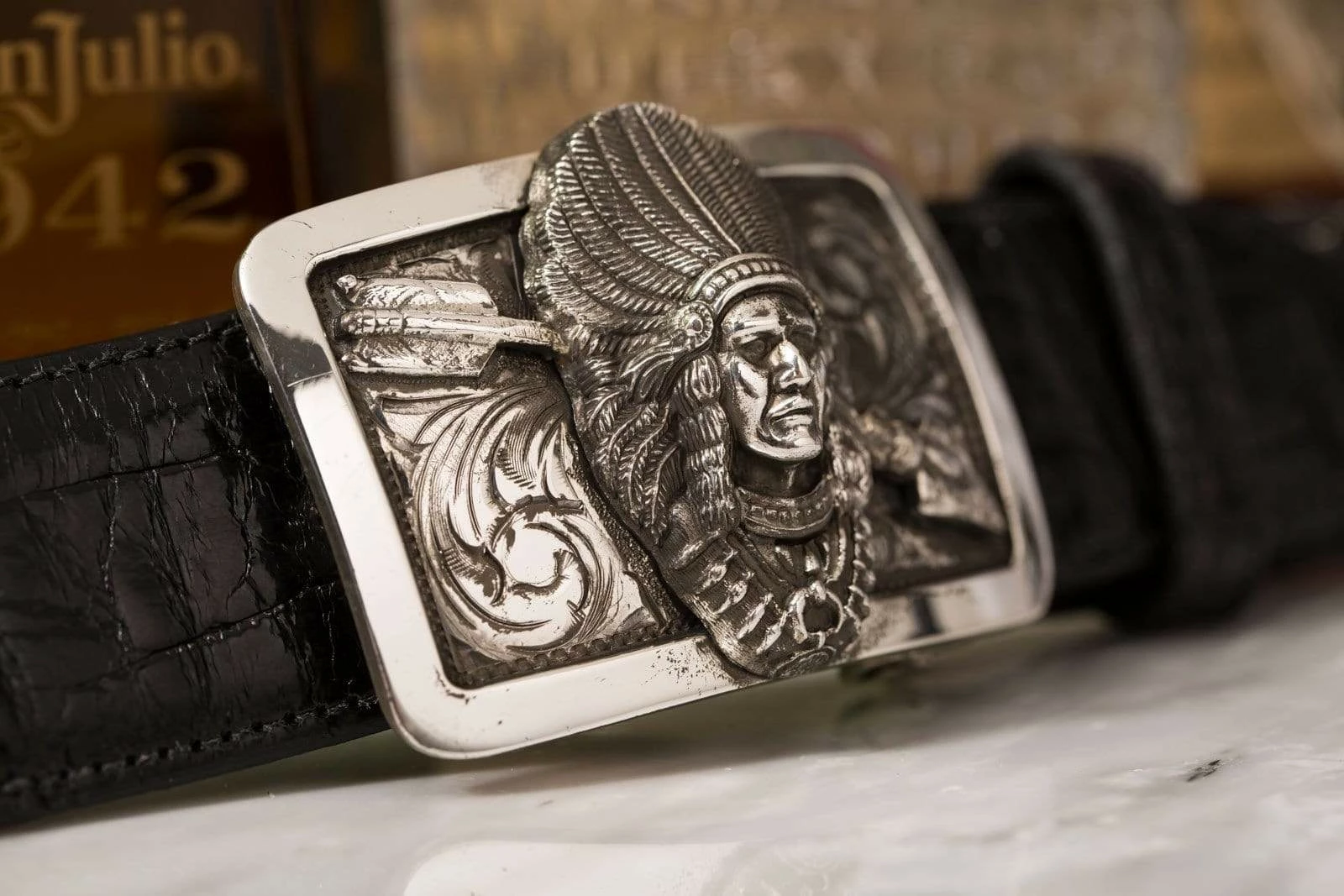 The Mason Ute Arrow buckle by Comstock Heritage features a large sterling silver chief motif headlining a coat of arms-style arrangement of wispy floral engraving and a sterling silver arrow sigil. The diagonally crossed arrow and engraving pattern create a spatial balance to support the prominent central motif as it rises out from and beyond the borders two-dimensional space. Handmade to fit a 1.5in belt strap.