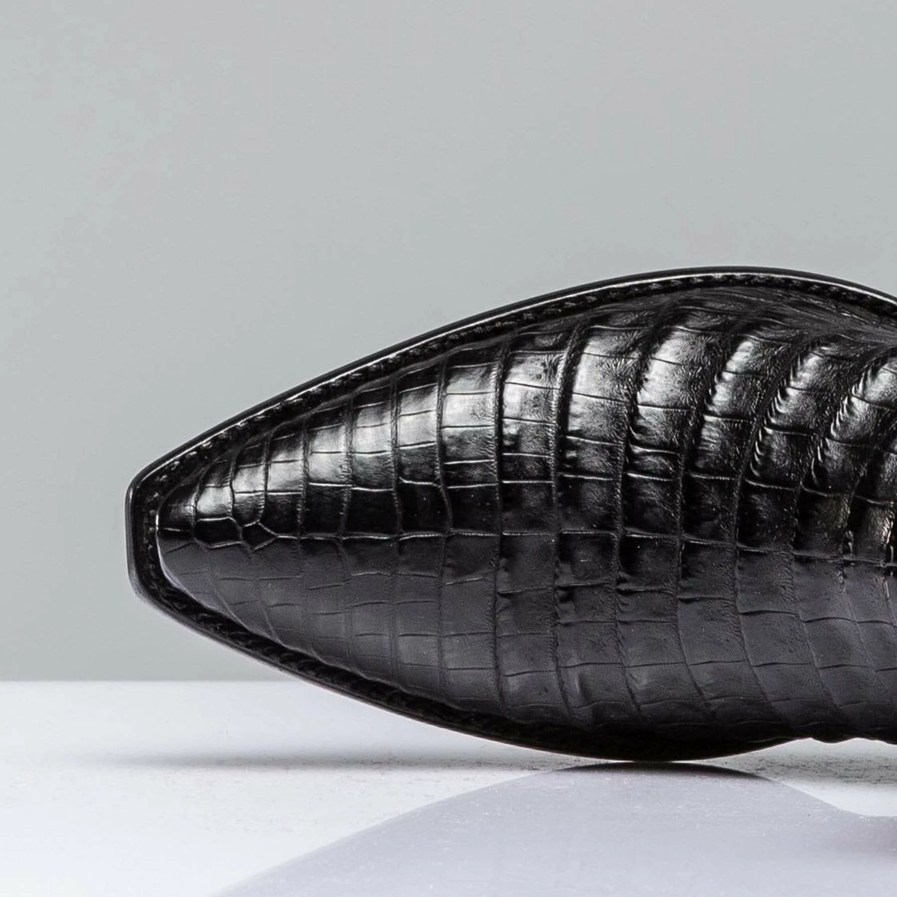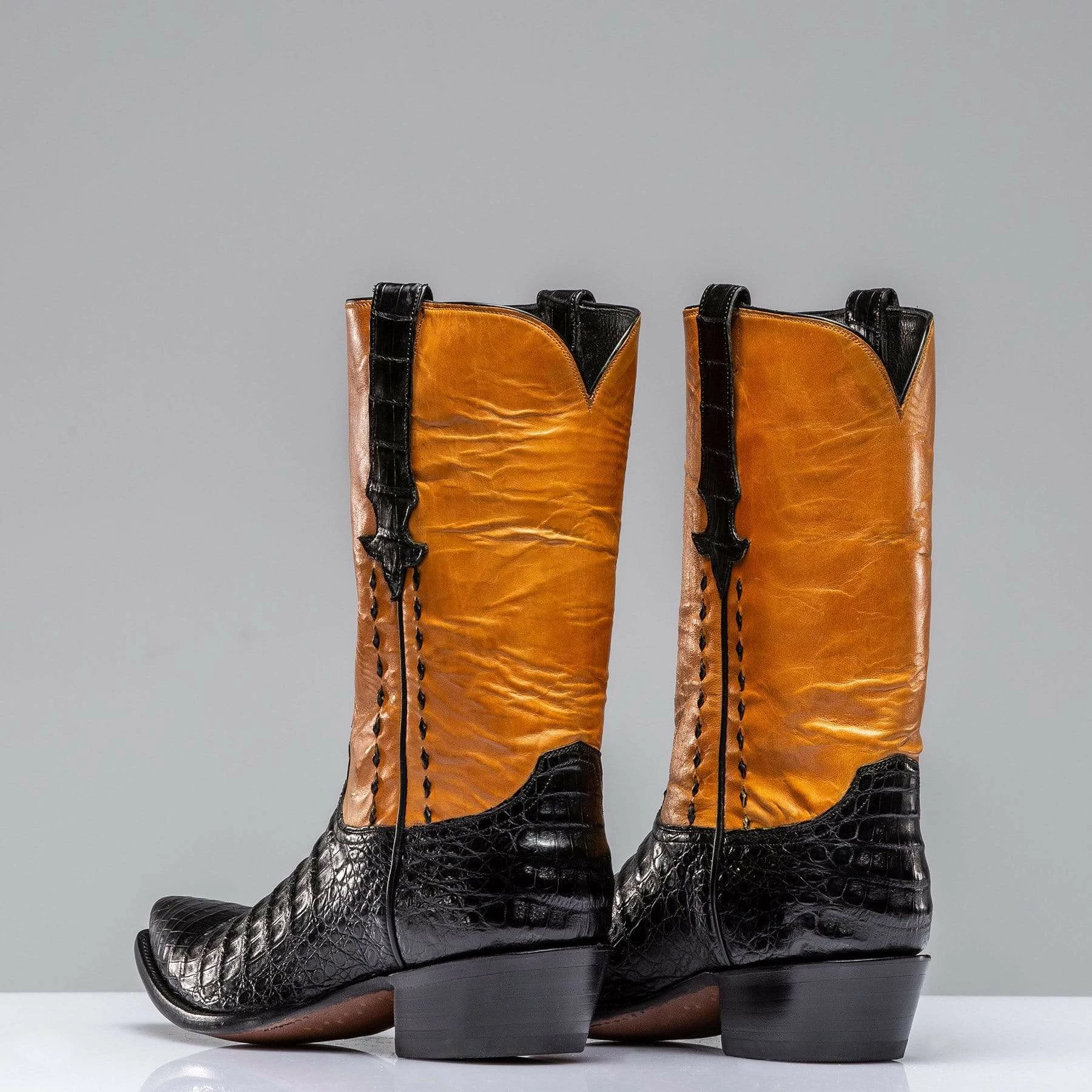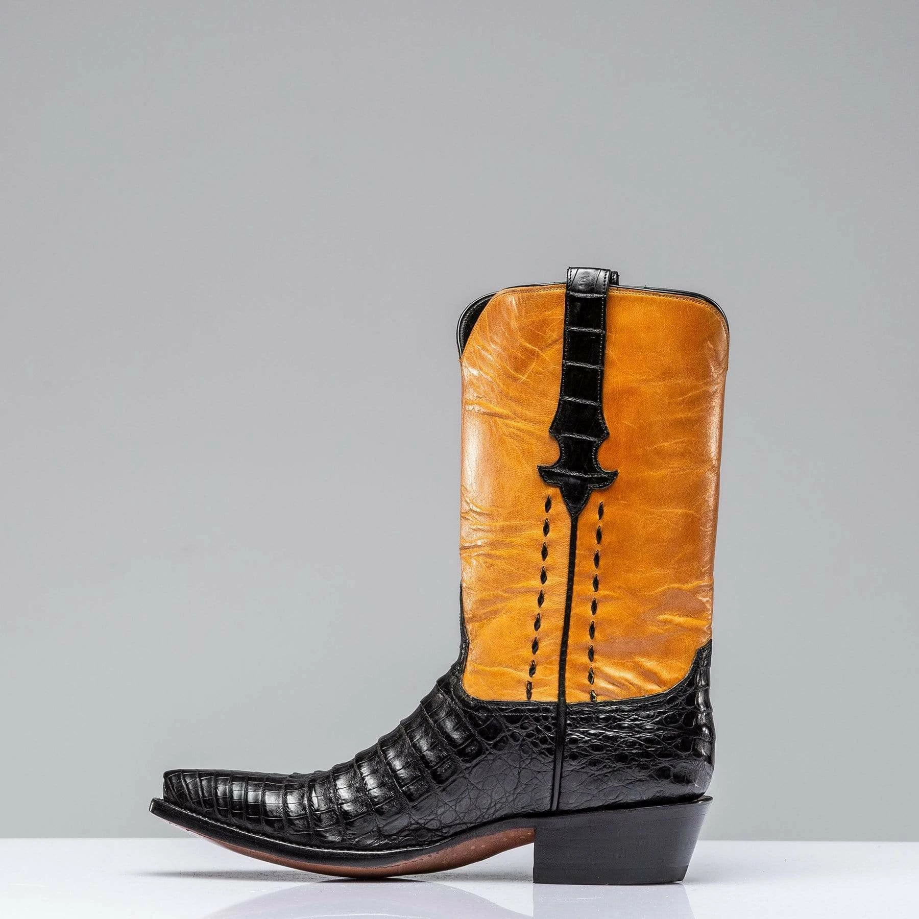 Matagorda caiman boot with a contrasting leather shaft. Buck lacing along side seams, plus crocodile accents on pulls. Each pair is handmade by artisans from Stallion Boot Company of El Paso, Texas with 30 or more years of experience.