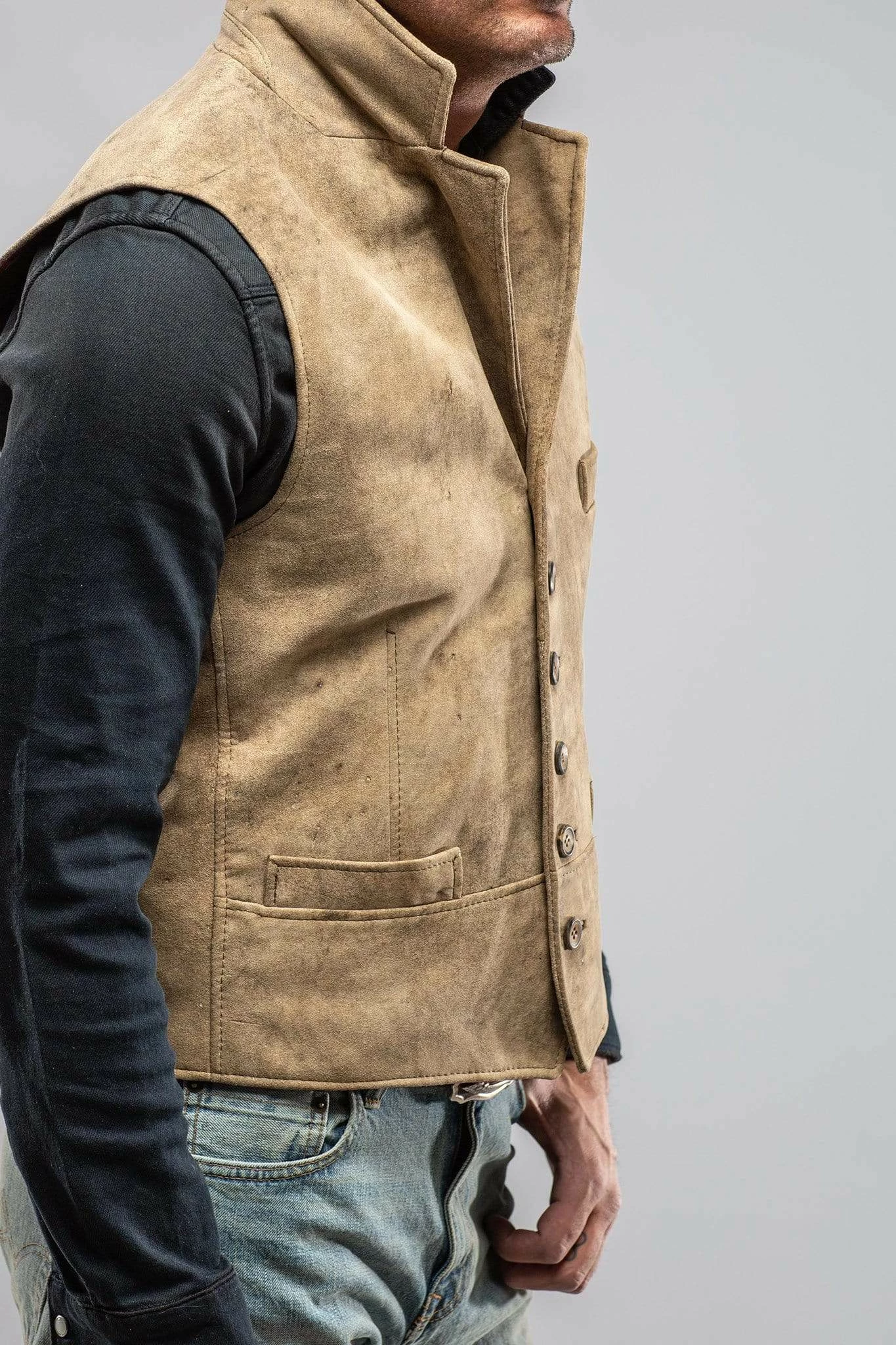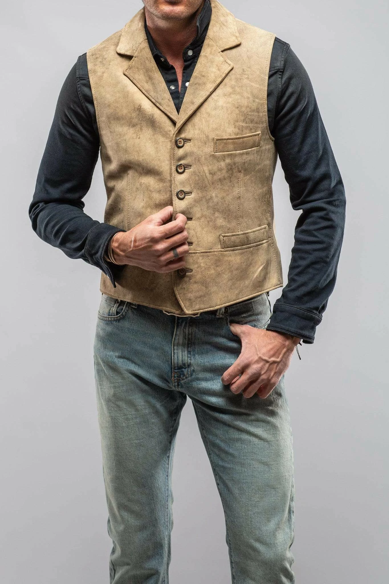 This vest in vintage beige, with a distressed look, will get even better as the years pass. A terrific layering piece , looks fabulous with both a turtle neck or dress shirt, making this an absolute essential which you will enjoy forever.