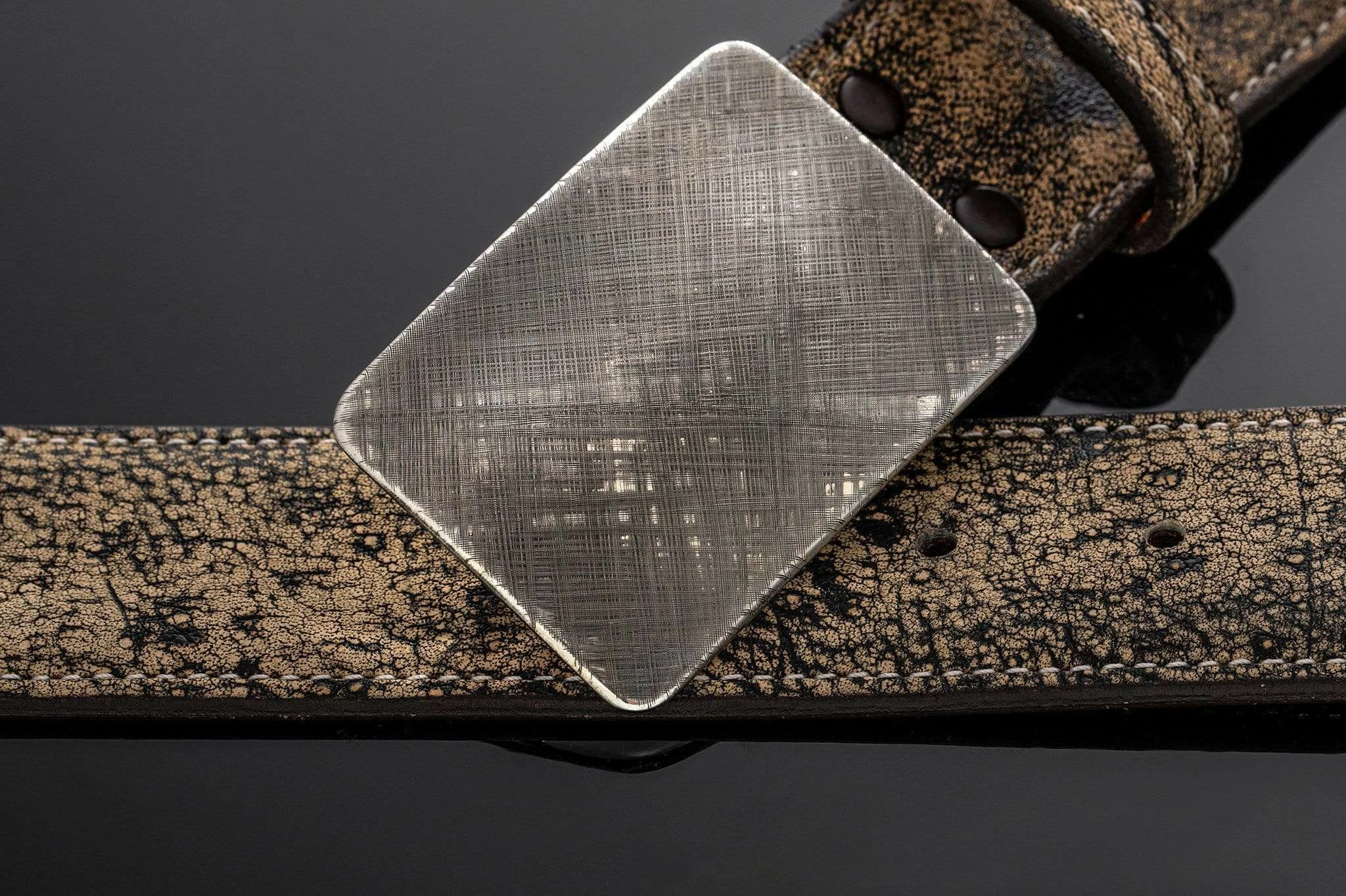 - “Mesa” shape belt buckle featuring Florentine hand engraving