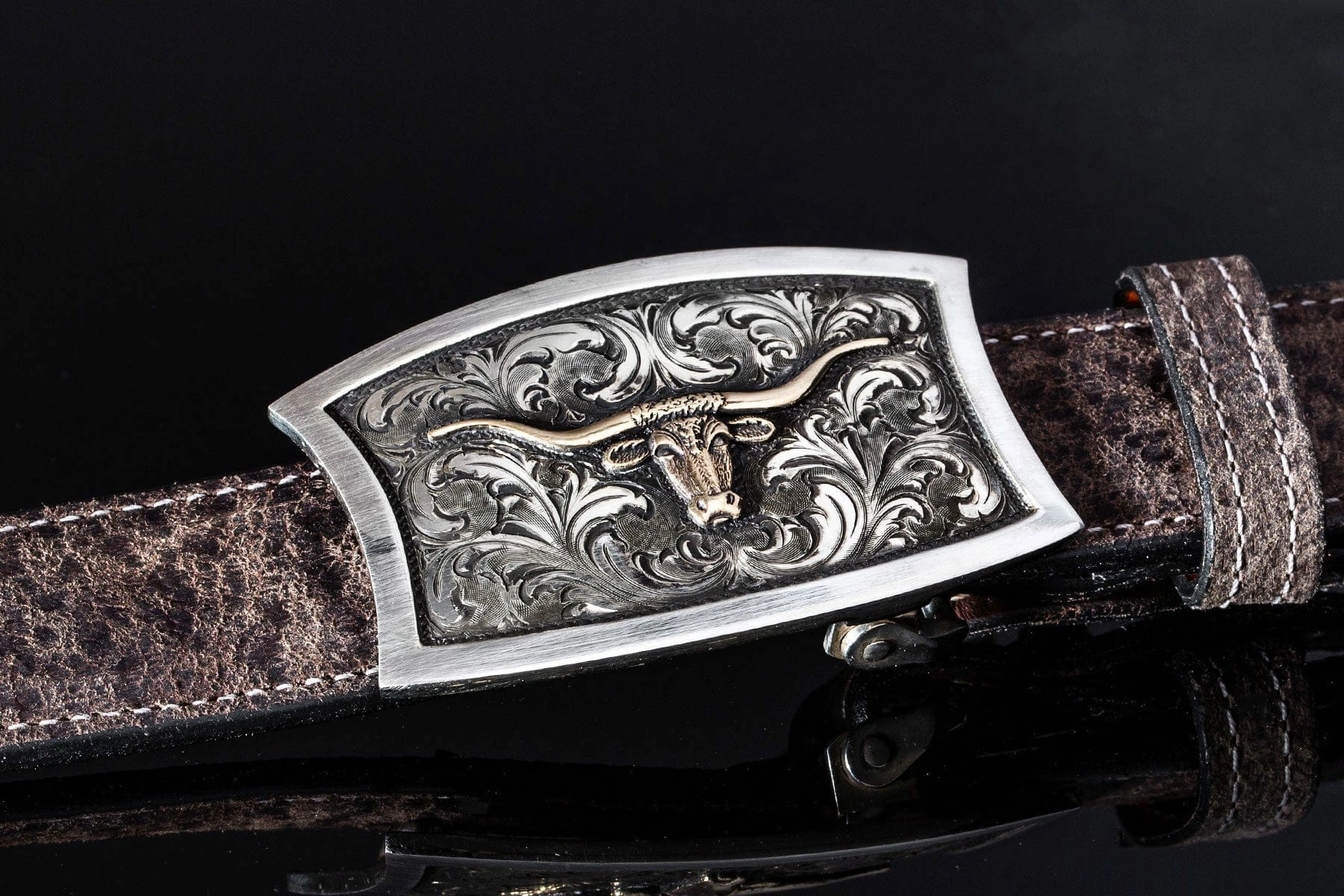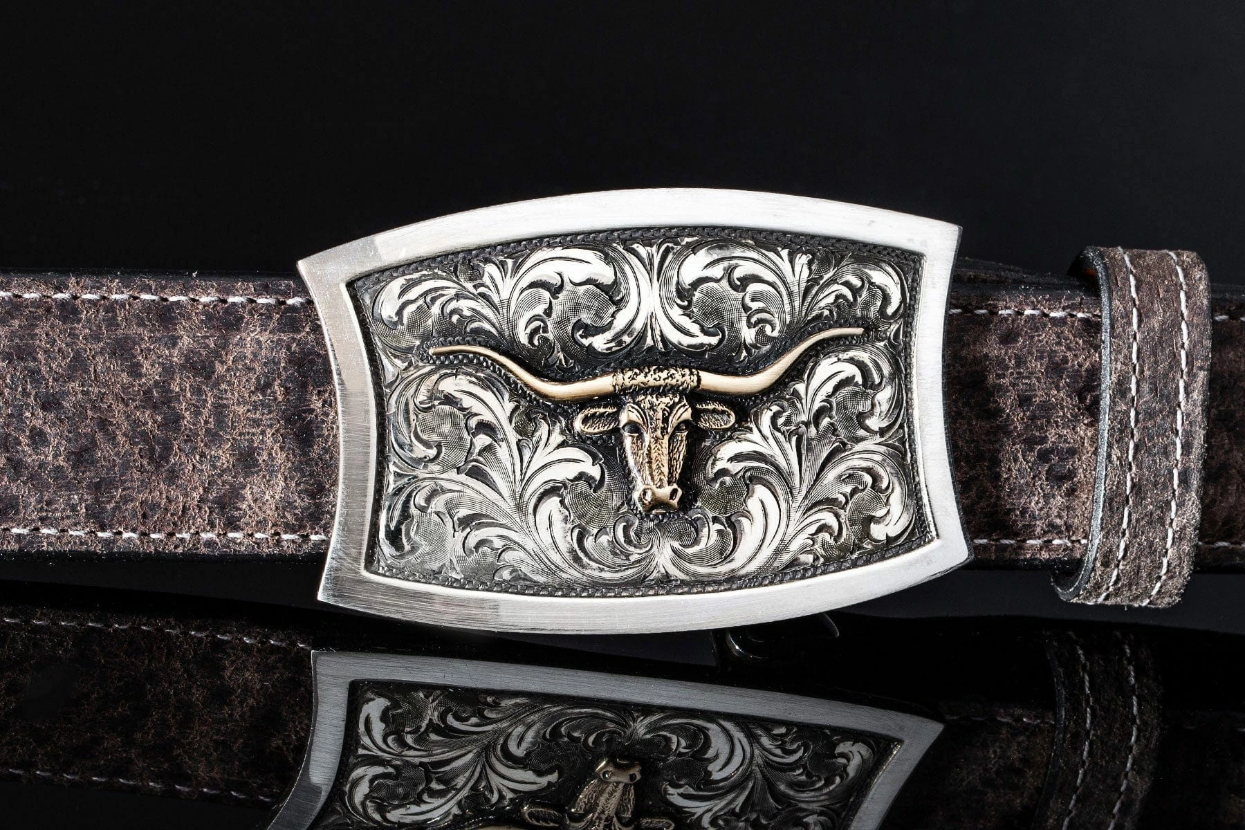 - Hand engraving around a 14k yellow gold longhorn figure in the center
