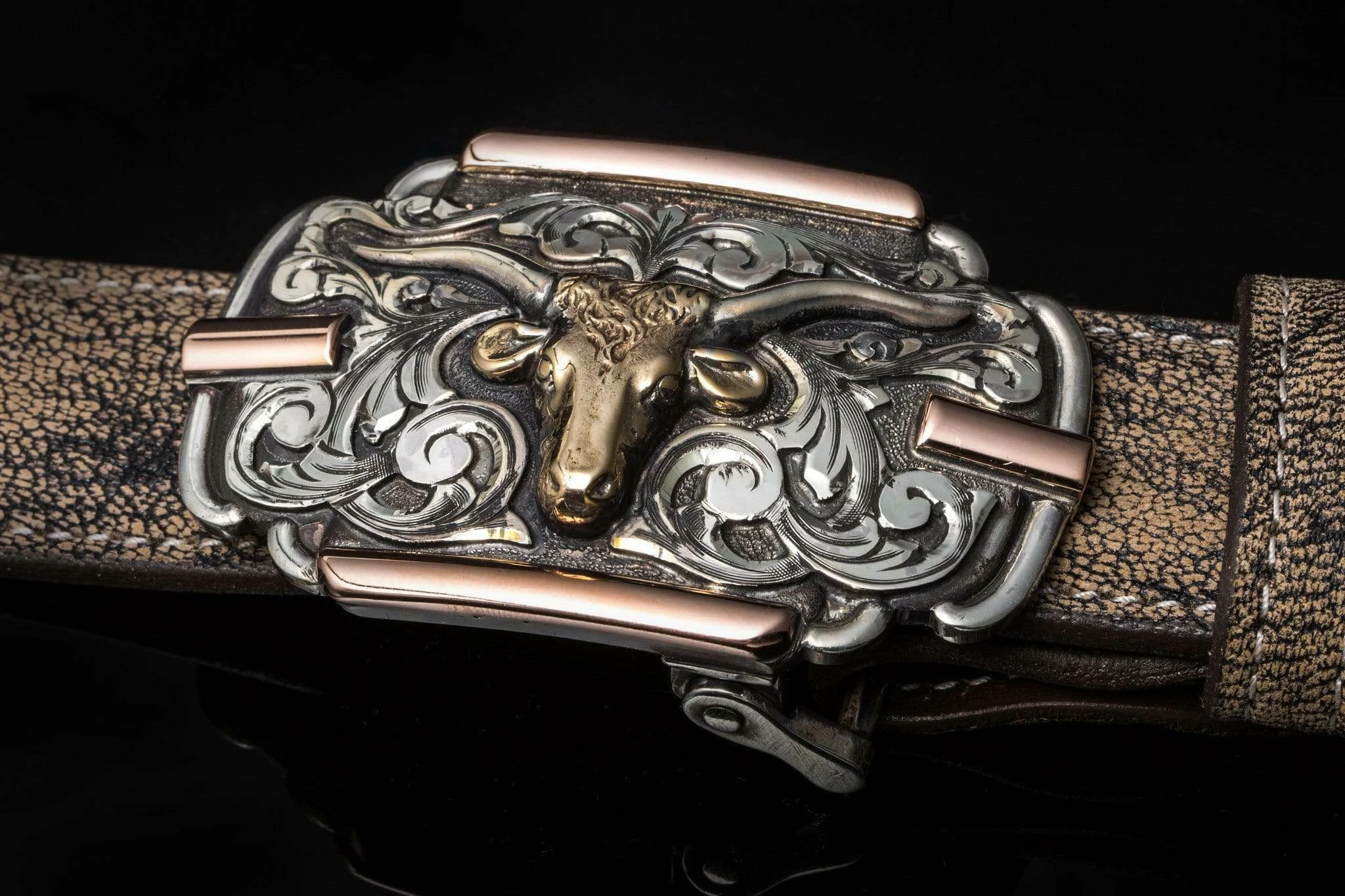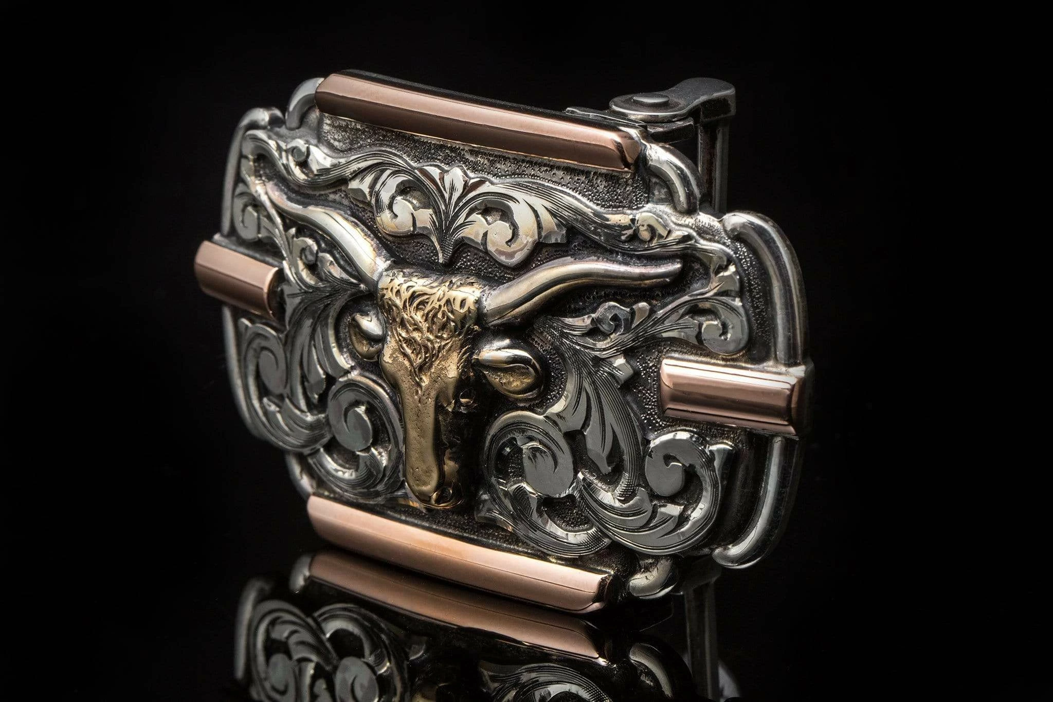 - Hand-engraved 14k sterling silver scrollwork and longhorn motif on a stippled sterling base
