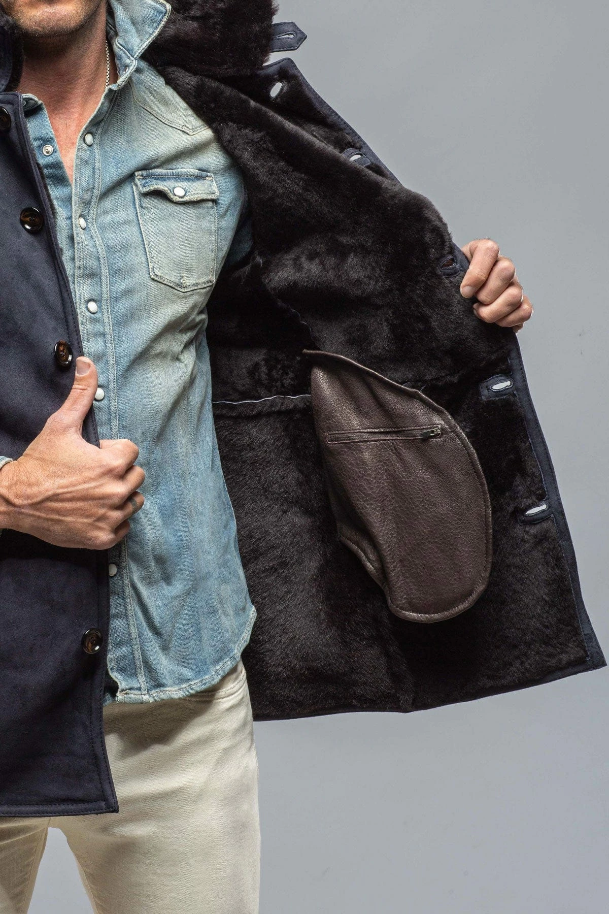 - Exterior pockets: two shearling pouches