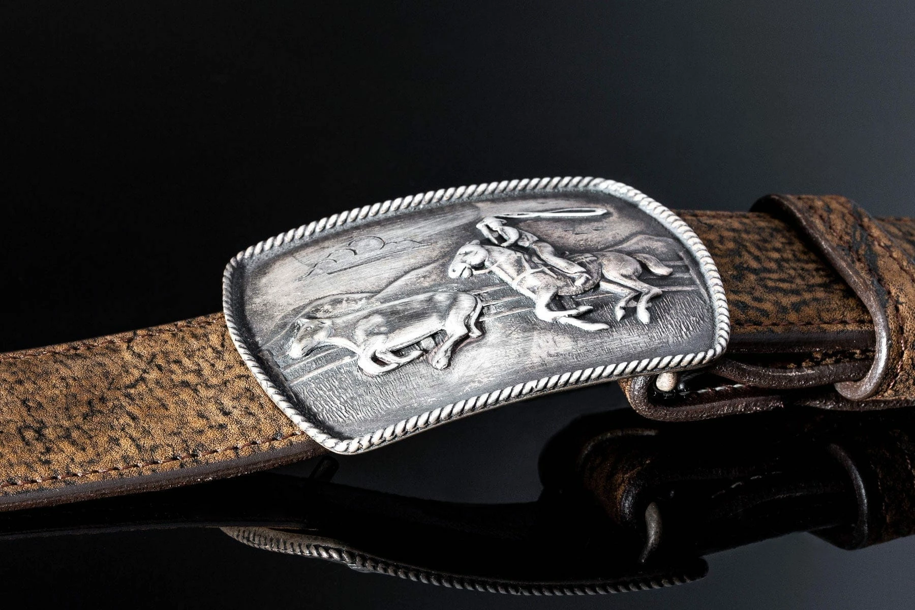 - Raised rope edge in S/S. With S/S Steer roper chasing sterling silver hand cast PB figure and fence scenery.