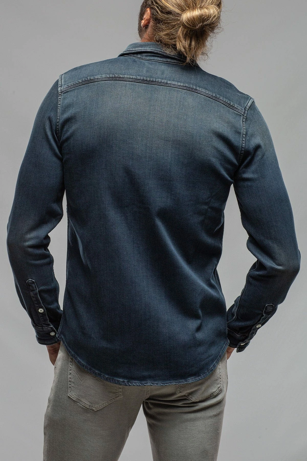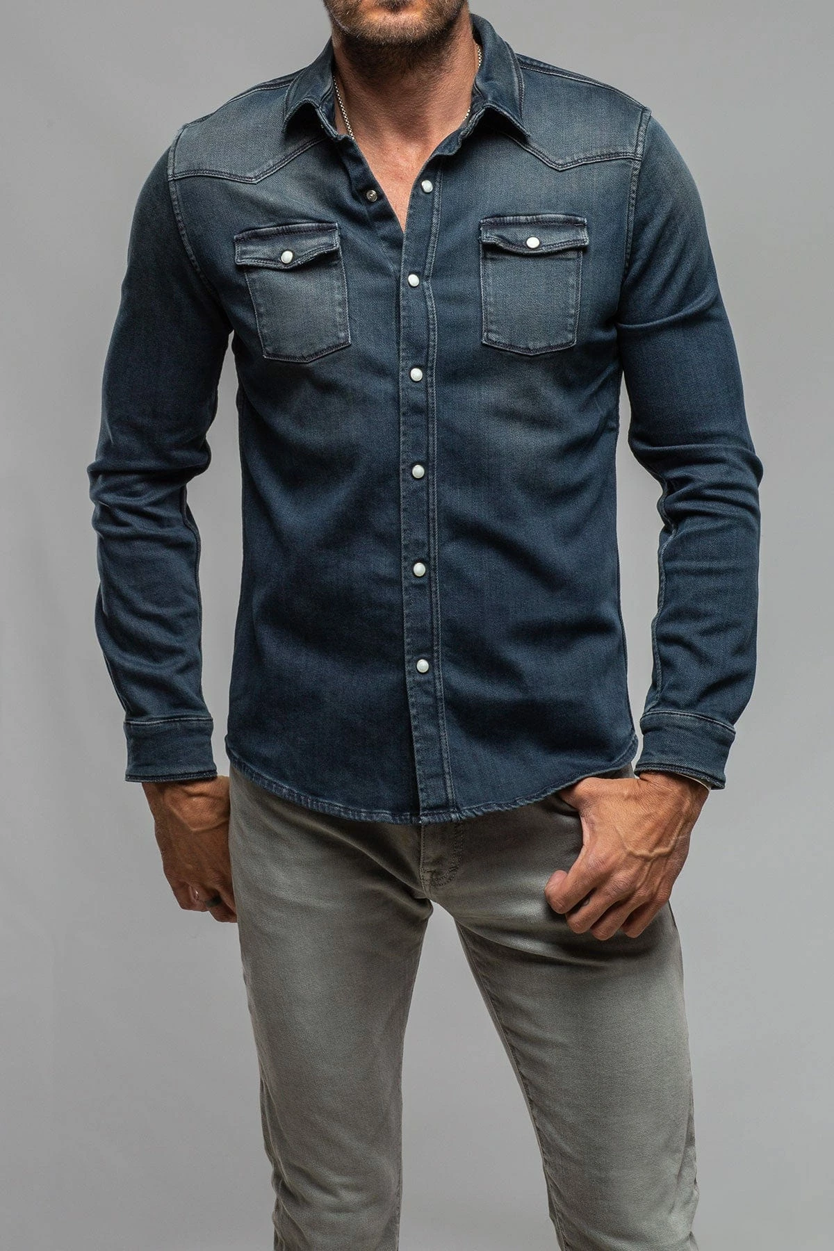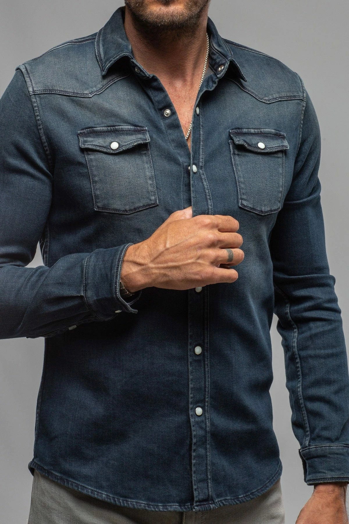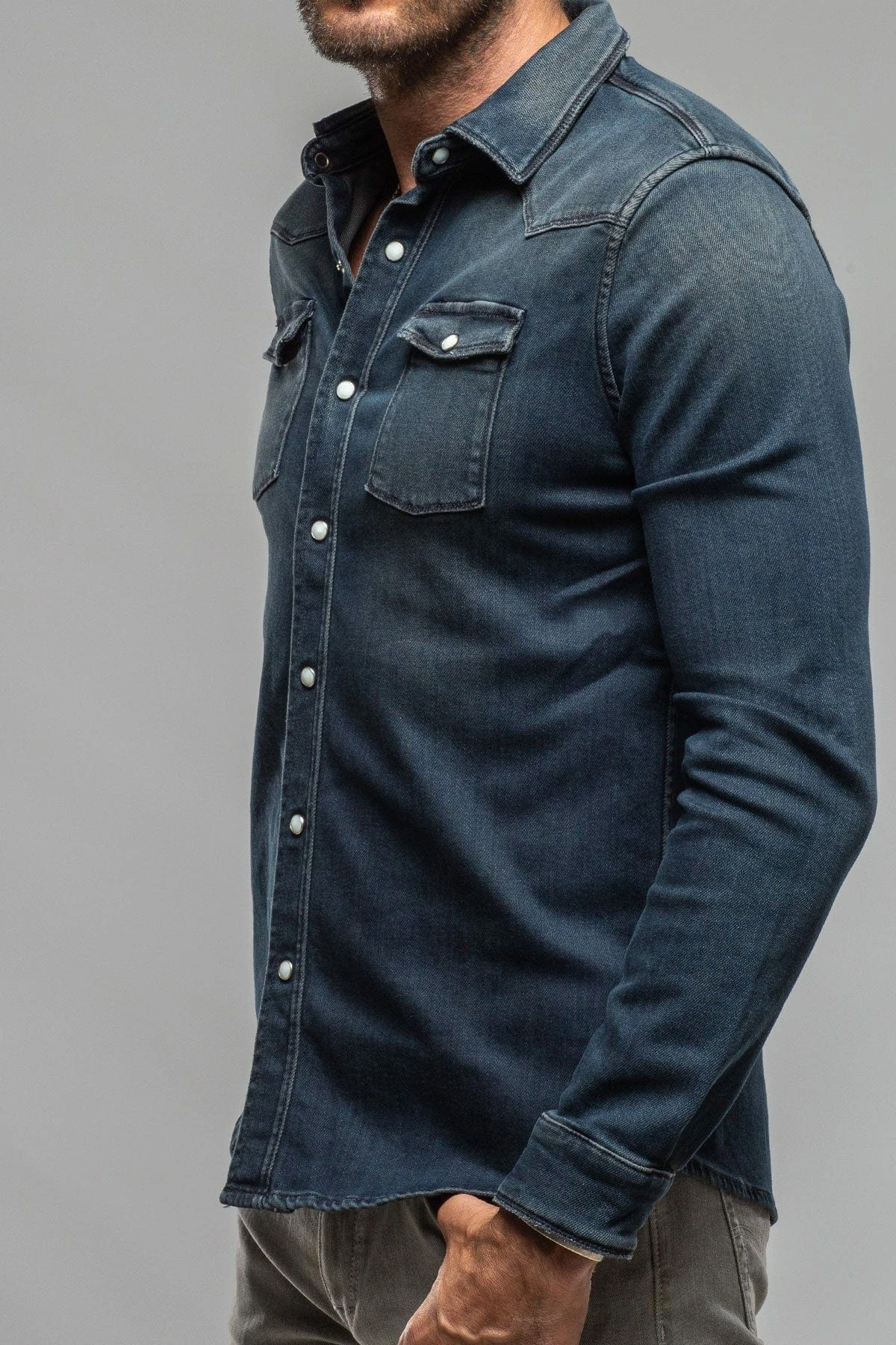 We have for years been searching for a fabric to create the perfect Axel’s denim shirt; one with enough stretch for comfort, and a beefy, not ‘boardy’ look and feel. Finally, we’ve found exactly what we’d been searching for… but better! Individually dyed, washed and vintaged by Italian artisans, the Roper denim snap shirt features profound Western inspiration, but with a precision that only the Italians can accomplish with clothing.