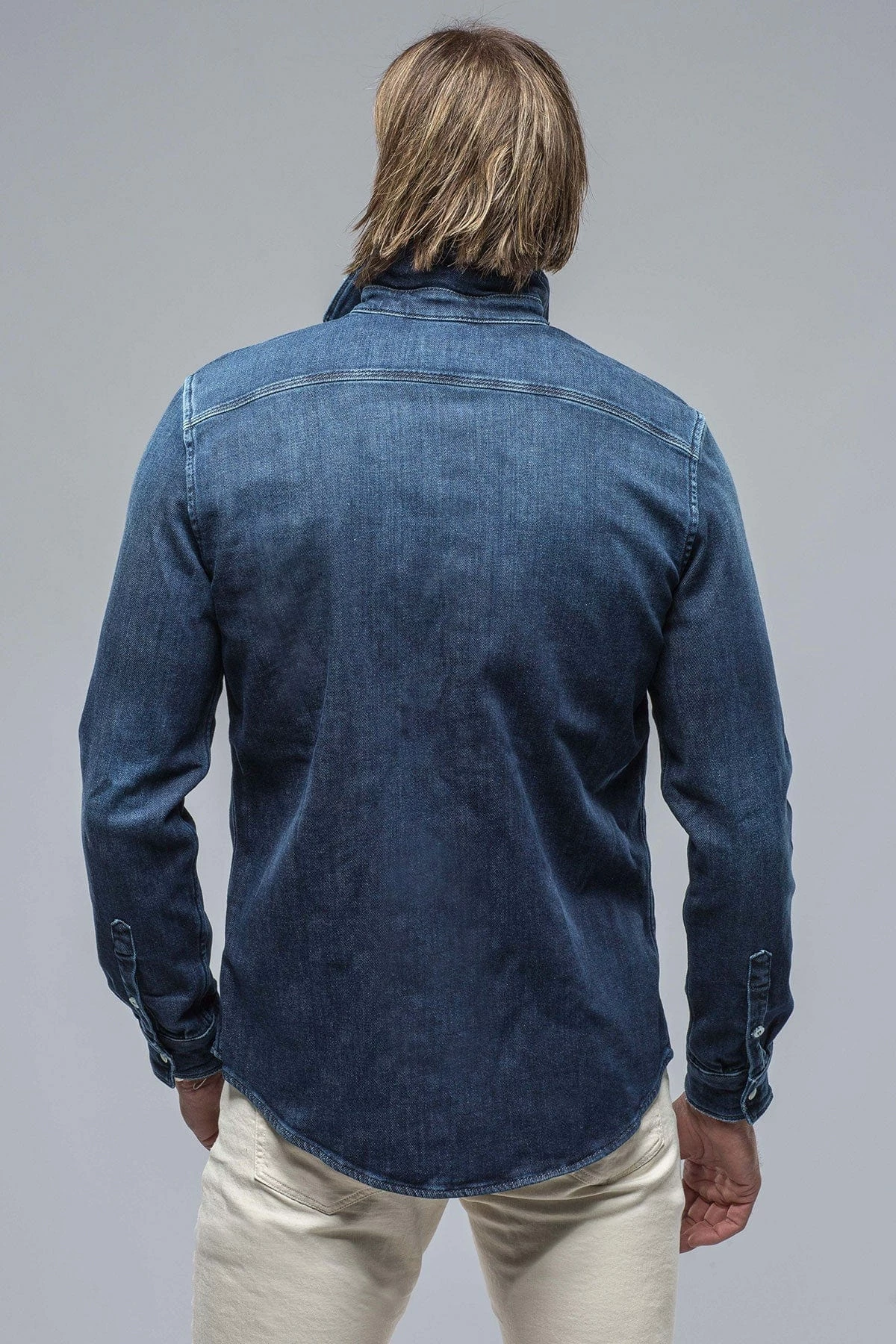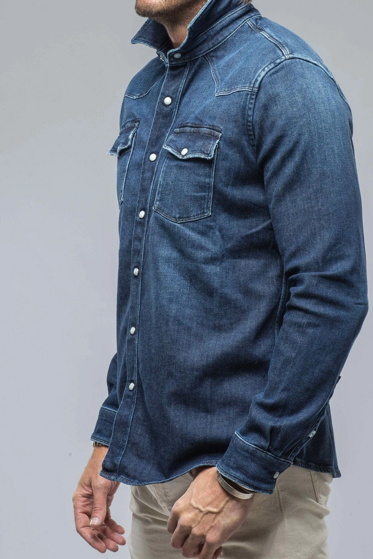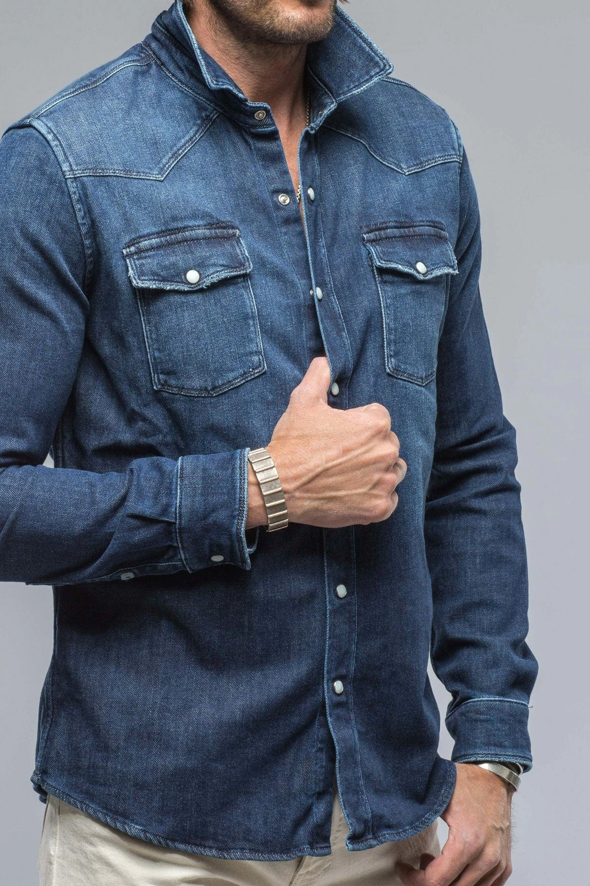 We have for years been searching for a fabric to create the perfect Axel’s denim shirt; one with enough stretch for comfort, and a beefy, not ‘boardy’ look and feel. Finally, we’ve found exactly what we’d been searching for… but better! Individually dyed, washed and vintaged by Italian artisans, the Roper denim snap shirt features profound Western inspiration, but with a precision that only the Italians can accomplish with clothing.