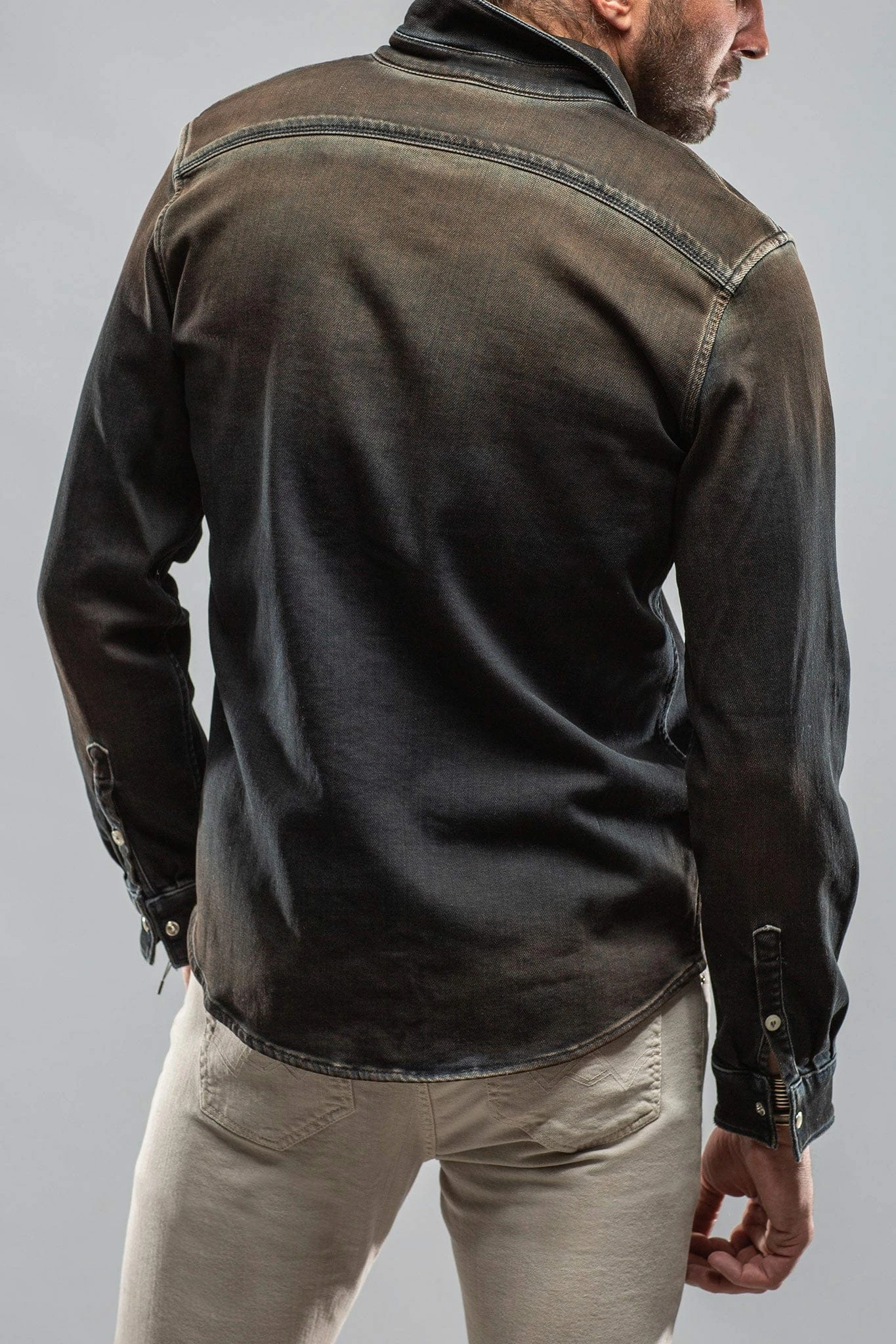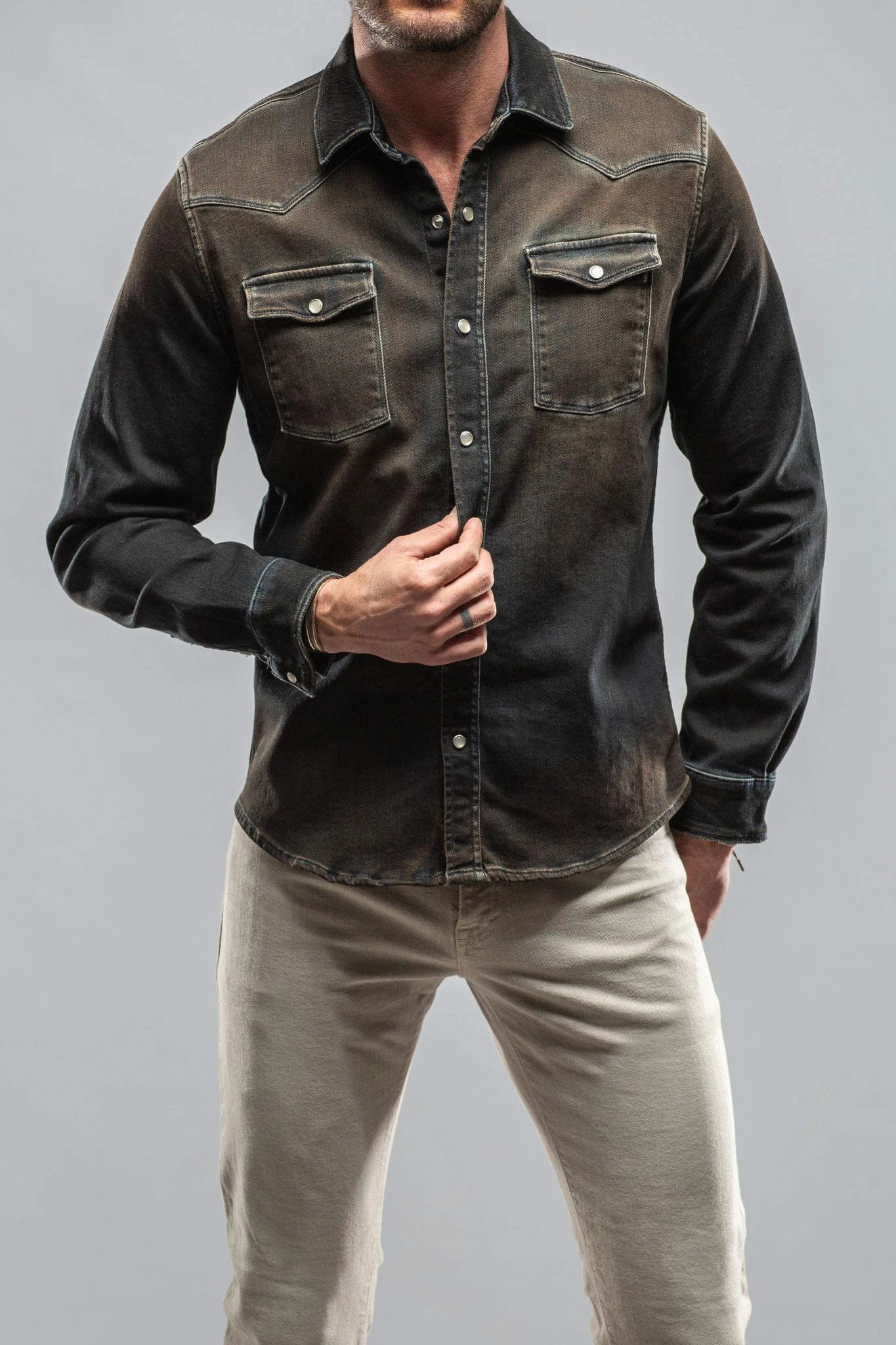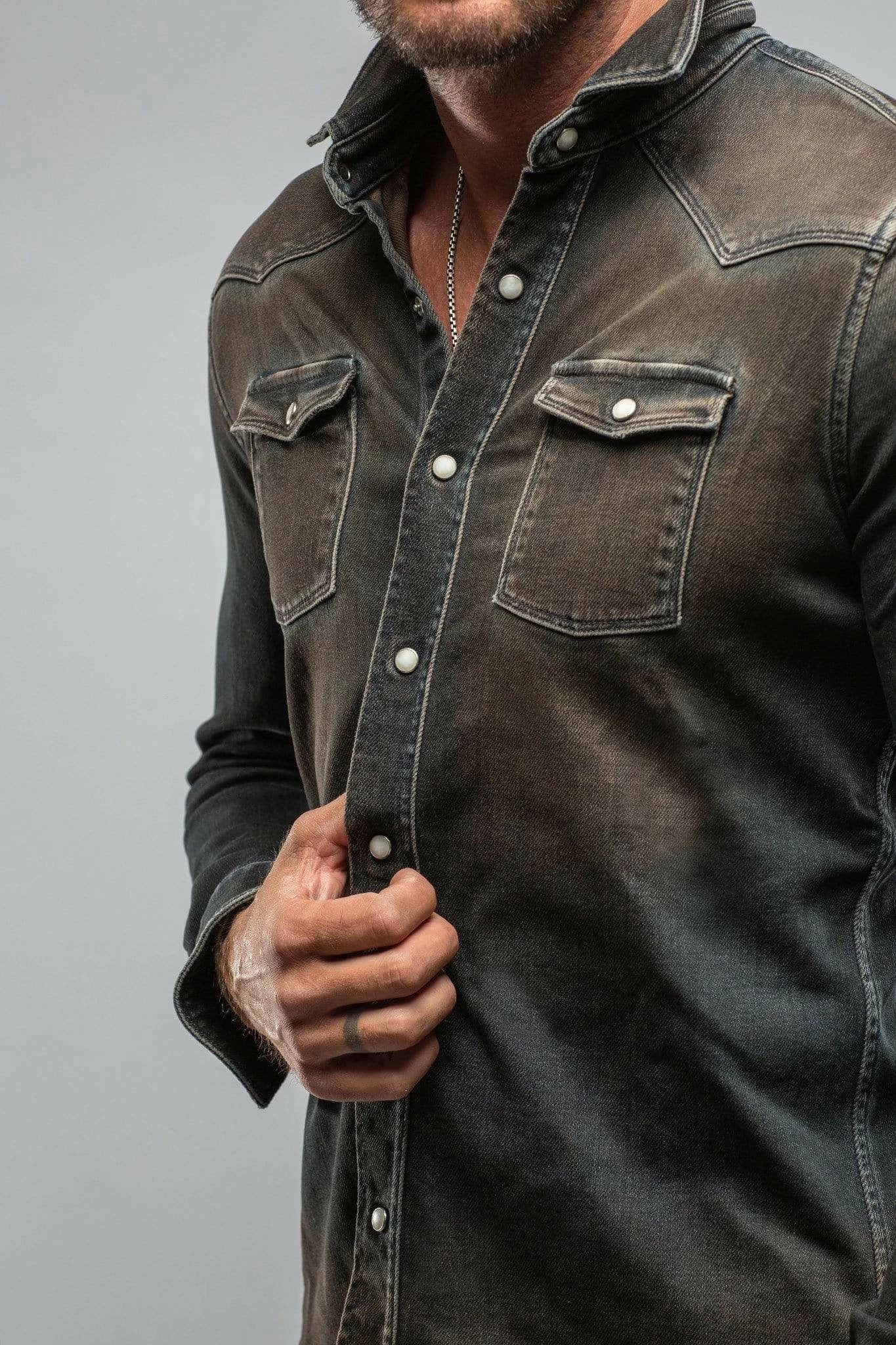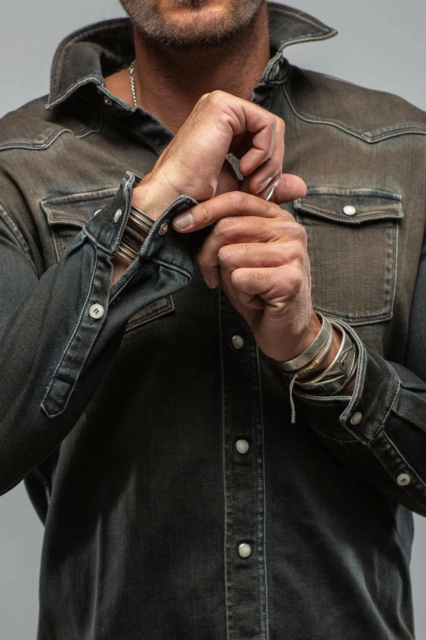 We have for years been searching for a fabric to create the perfect Axel’s denim shirt; one with enough stretch for comfort, and a beefy, not ‘boardy’ look and feel. Finally, we’ve found exactly what we’d been searching for… but better! Individually dyed, washed and vintaged by Italian artisans, the Roper denim snap shirt features profound Western inspiration, but with a precision that only the Italians can accomplish with clothing.