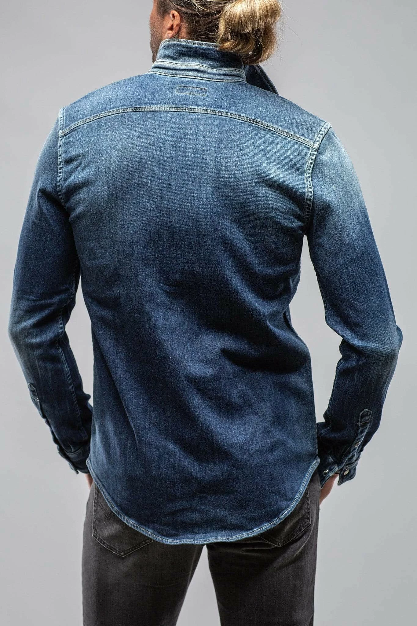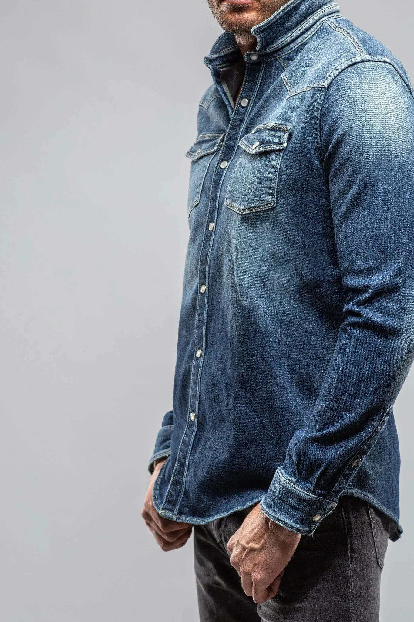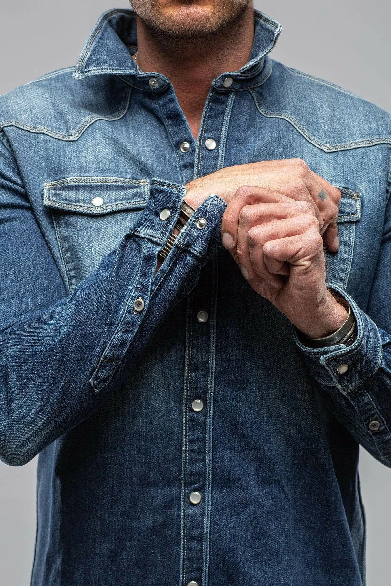 We have for years been searching for a fabric to create the perfect Axel’s denim shirt; one with enough stretch for comfort, and a beefy, not ‘boardy’ look and feel. Finally, we’ve found exactly what we’d been searching for… but better! Individually dyed, washed and vintaged by Italian artisans, the Roper denim snap shirt features profound Western inspiration, but with a precision that only the Italians can accomplish with clothing.