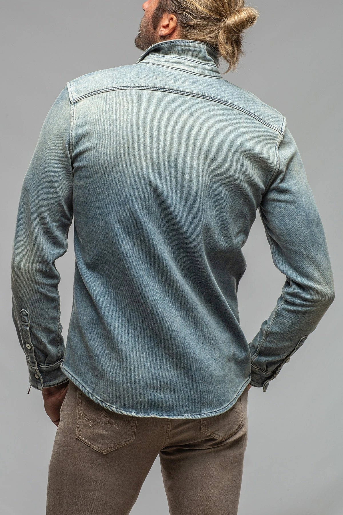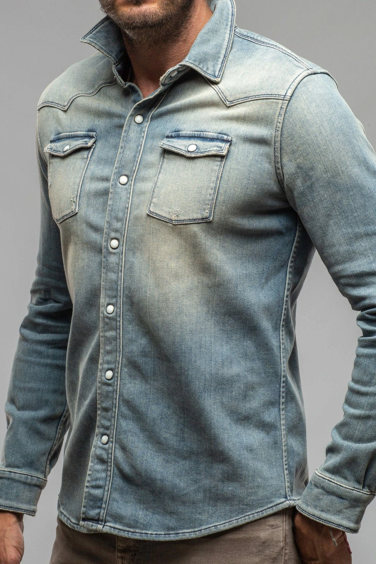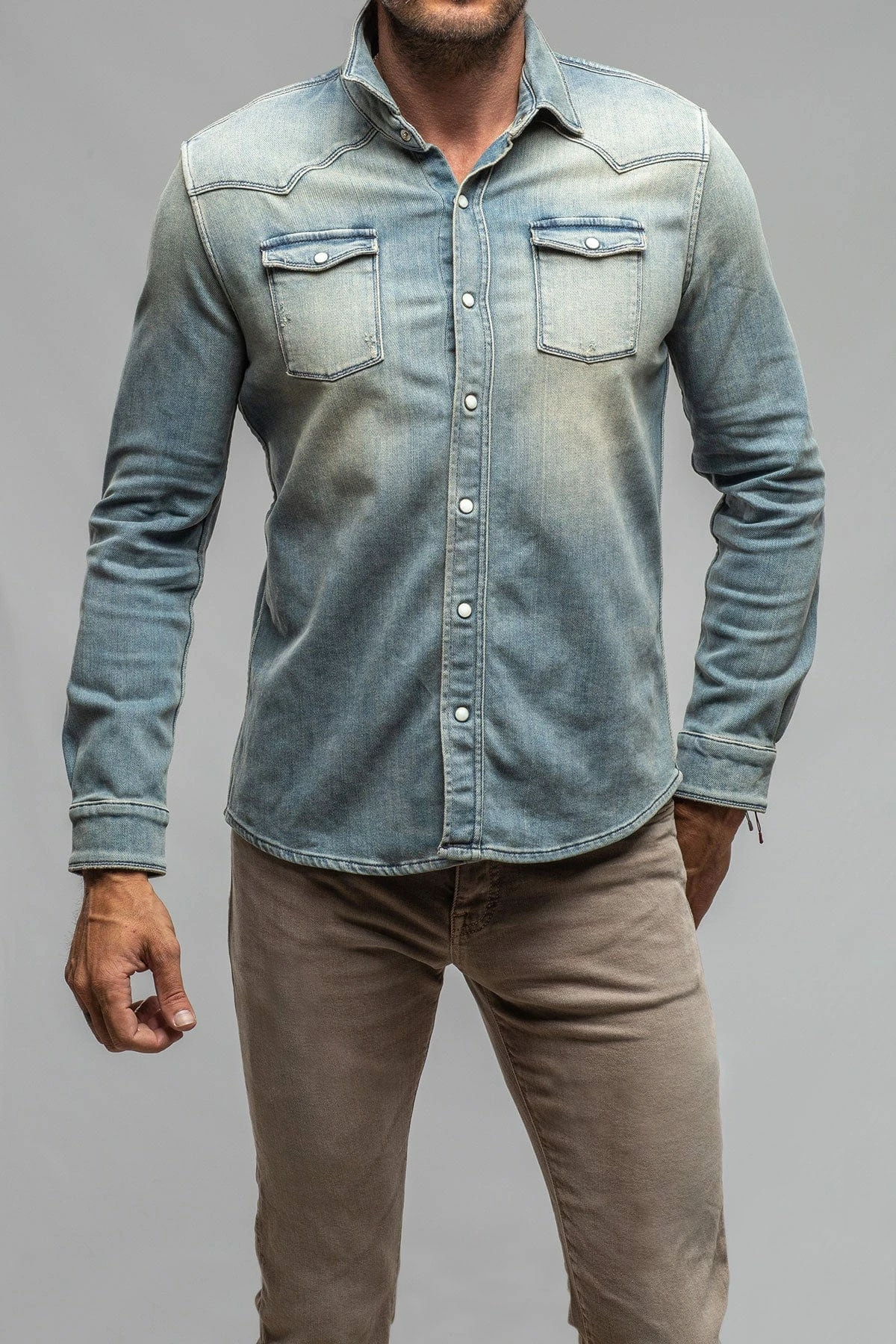 We have for years been searching for a fabric to create the perfect Axel’s denim shirt; one with enough stretch for comfort, and a beefy, not ‘boardy’ look and feel. Finally, we’ve found exactly what we’d been searching for… but better! Individually dyed, washed and vintaged by Italian artisans, the Roper denim snap shirt features profound Western inspiration, but with a precision that only the Italians can accomplish with clothing.