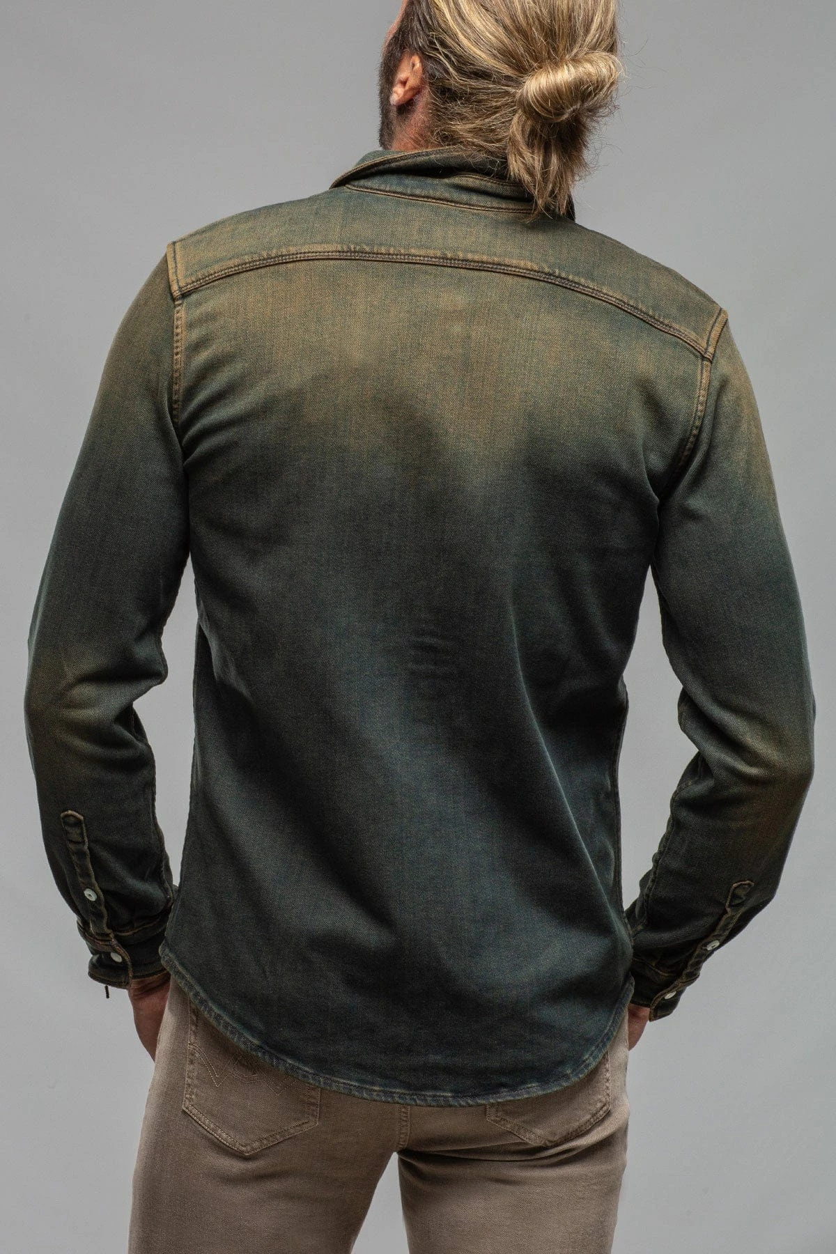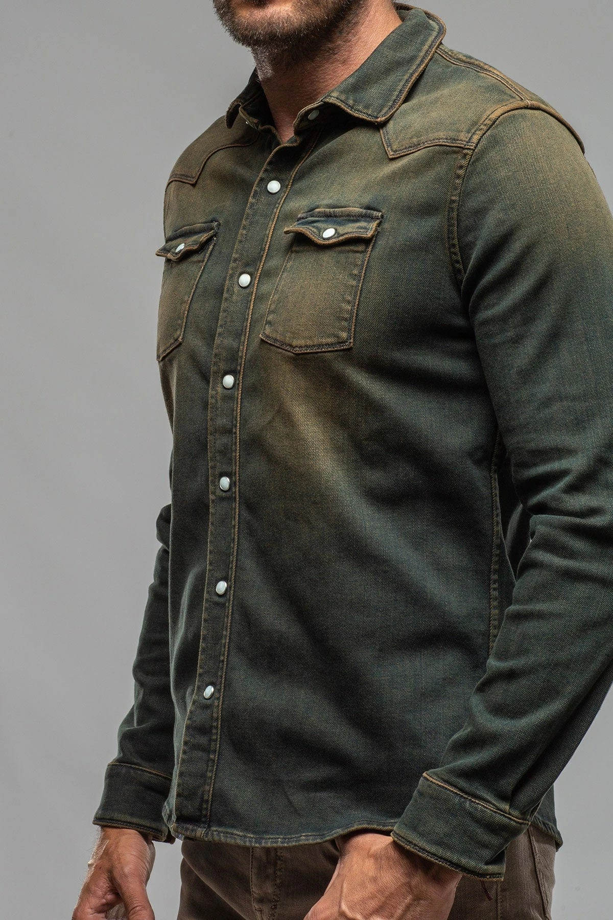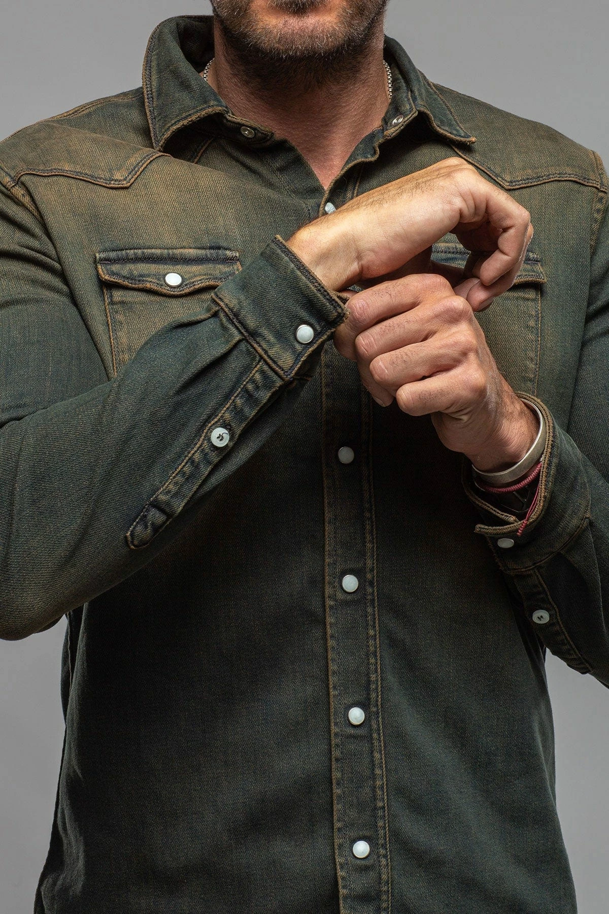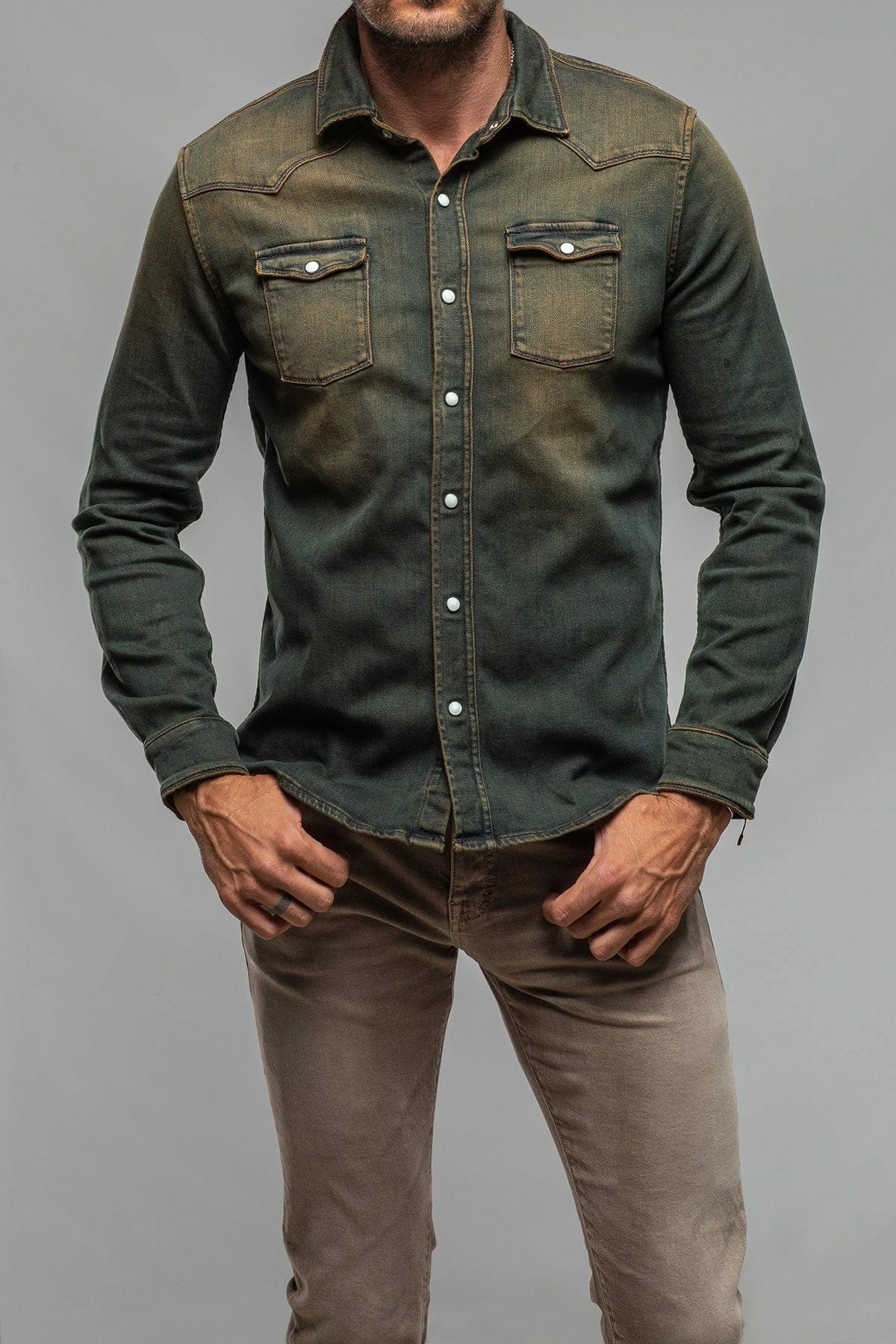 We have for years been searching for a fabric to create the perfect Axel’s denim shirt; one with enough stretch for comfort, and a beefy, not ‘boardy’ look and feel. Finally, we’ve found exactly what we’d been searching for… but better! Individually dyed, washed and vintaged by Italian artisans, the Roper denim snap shirt features profound Western inspiration, but with a precision that only the Italians can accomplish with clothing.