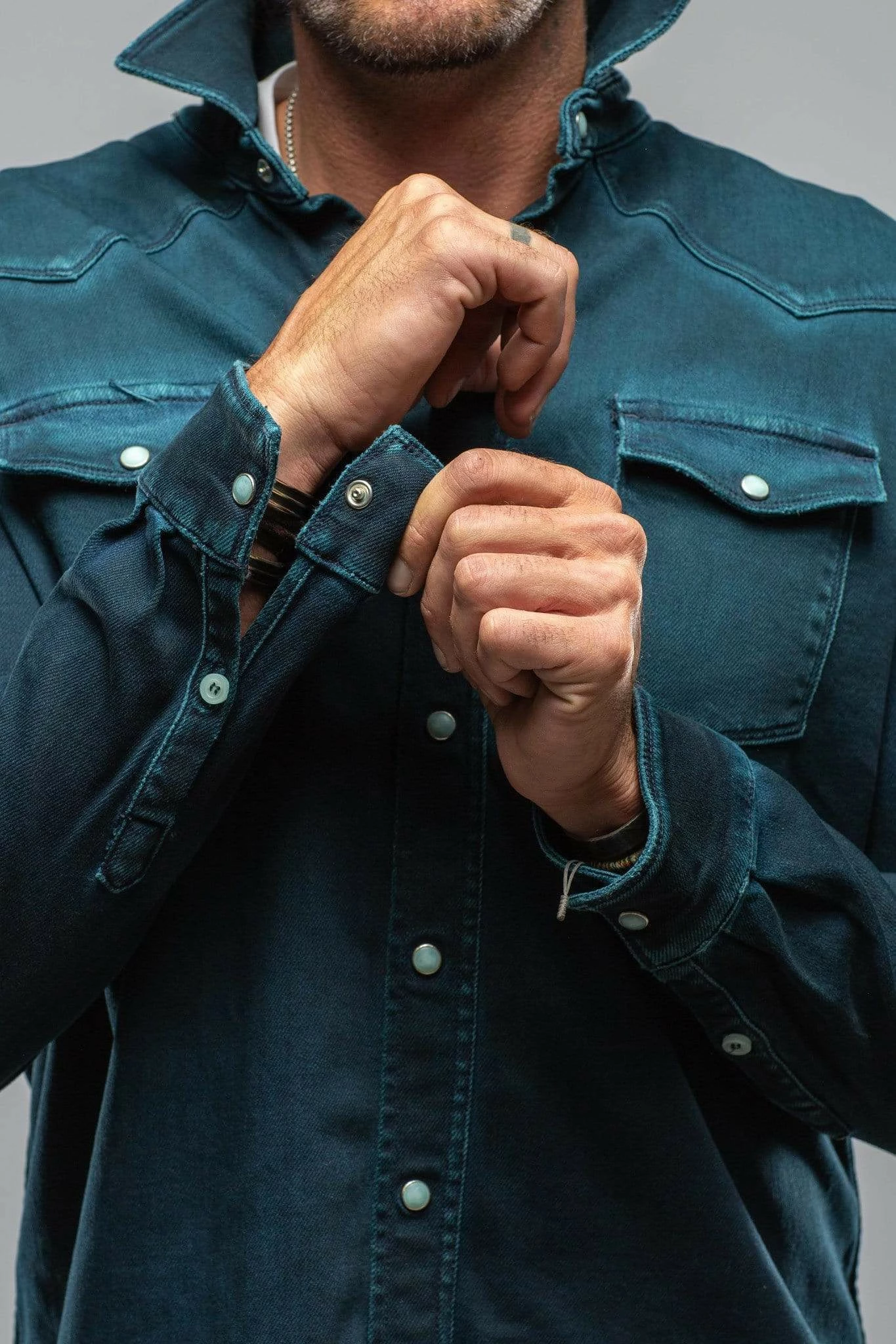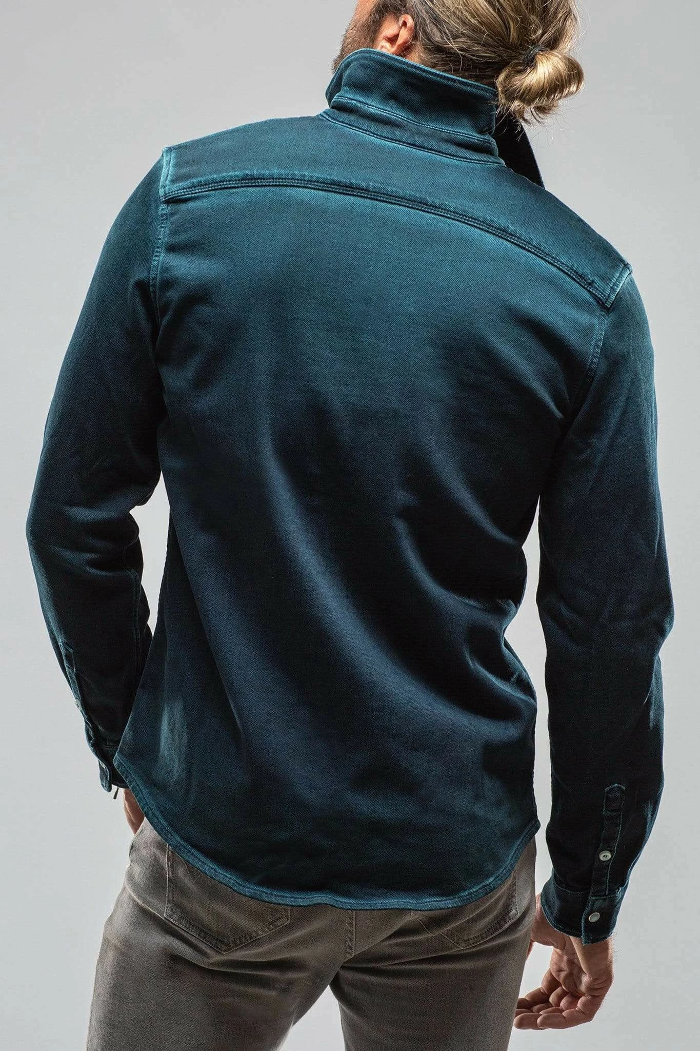 We have for years been searching for a fabric to create the perfect Axel’s denim shirt; one with enough stretch for comfort, and a beefy, not ‘boardy’ look and feel. Finally, we’ve found exactly what we’d been searching for… but better! Individually dyed, washed and vintaged by Italian artisans, the Roper denim snap shirt features profound Western inspiration, but with a precision that only the Italians can accomplish with clothing.