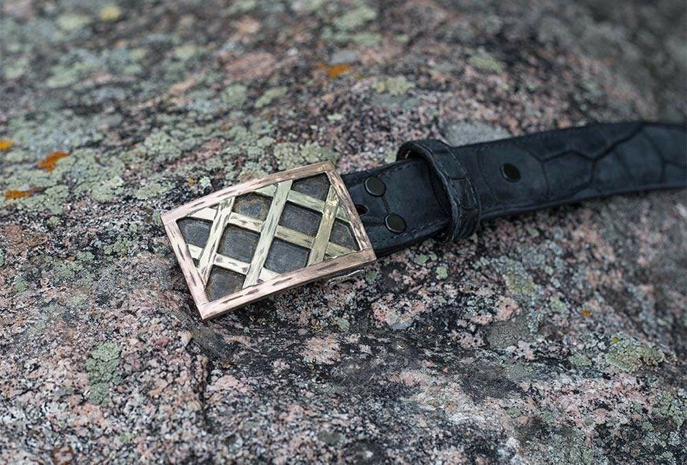 Here the silversmiths at Comstock Heritage have taken the classic log cabin design and turned it on its head. Cutting twelve individual strips of fourteen-karat rose gold, they have created a lattice of “logs” to cover the buckle’s blackened face. Each strip of rose gold is hand-engraved to resemble wood, and inlaid with sterling silver. This unique piece fits all 1.25-inch belt straps.,