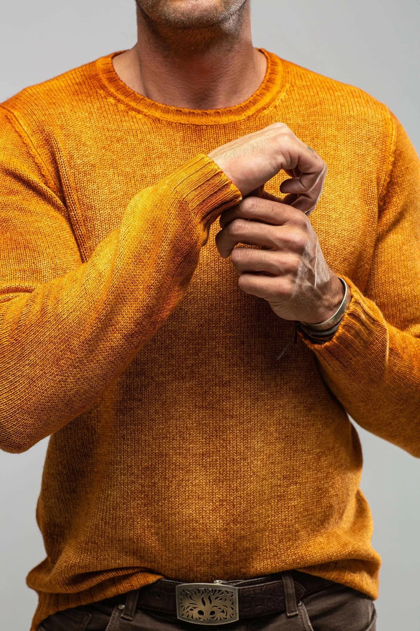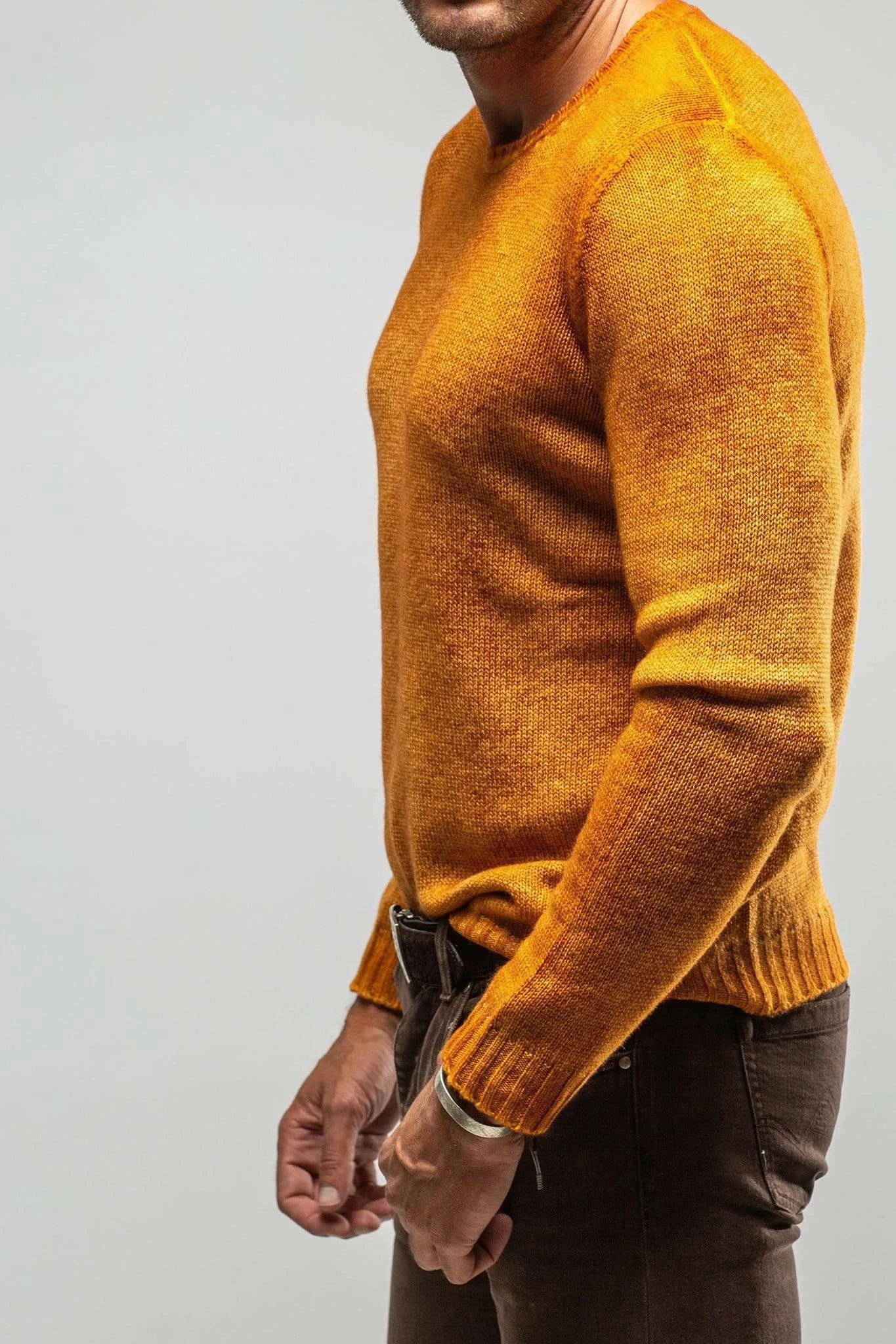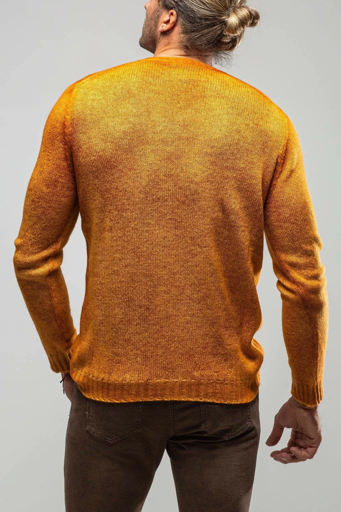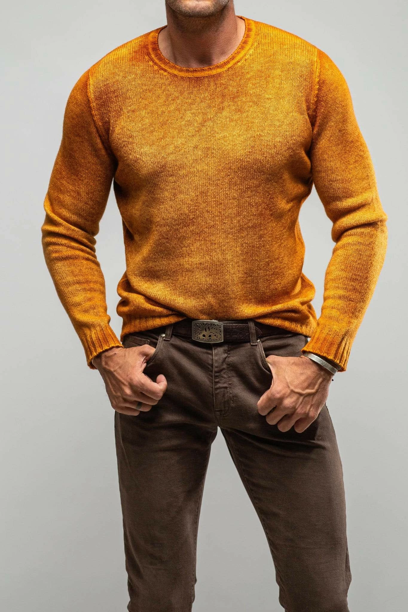 Like many of the handmade Avant Toi pieces, this hand-painted sweater started its color journey with a uniform golden ocra color. Using an impressive over-dye technique, a lighter color is lightly applied to the exterior of the cashmere creating unique shades and color-play, all while preserving the smokey underlayer to give it an extra touch of richness.