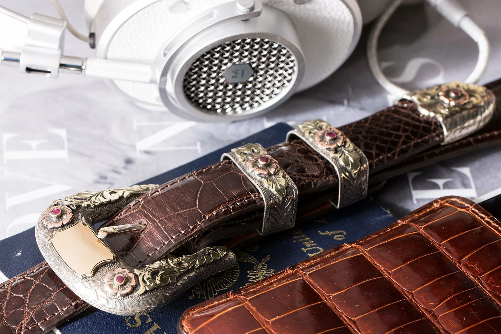 Here the silversmiths at Comstock use different colors and types of metal to create a stunning, four-piece buckle set. Laid atop hand-engraved sterling silver are green gold leaves and red gold flowers with ruby centers. Both keepers and the tip each have one flower, and the buckle has two. In between the two flowers on the buckle is a solid shield made of yellow gold. The mixture of colors, textures and dimensions make this a beautifully unique buckle set. Fits all 1-inch belt straps.