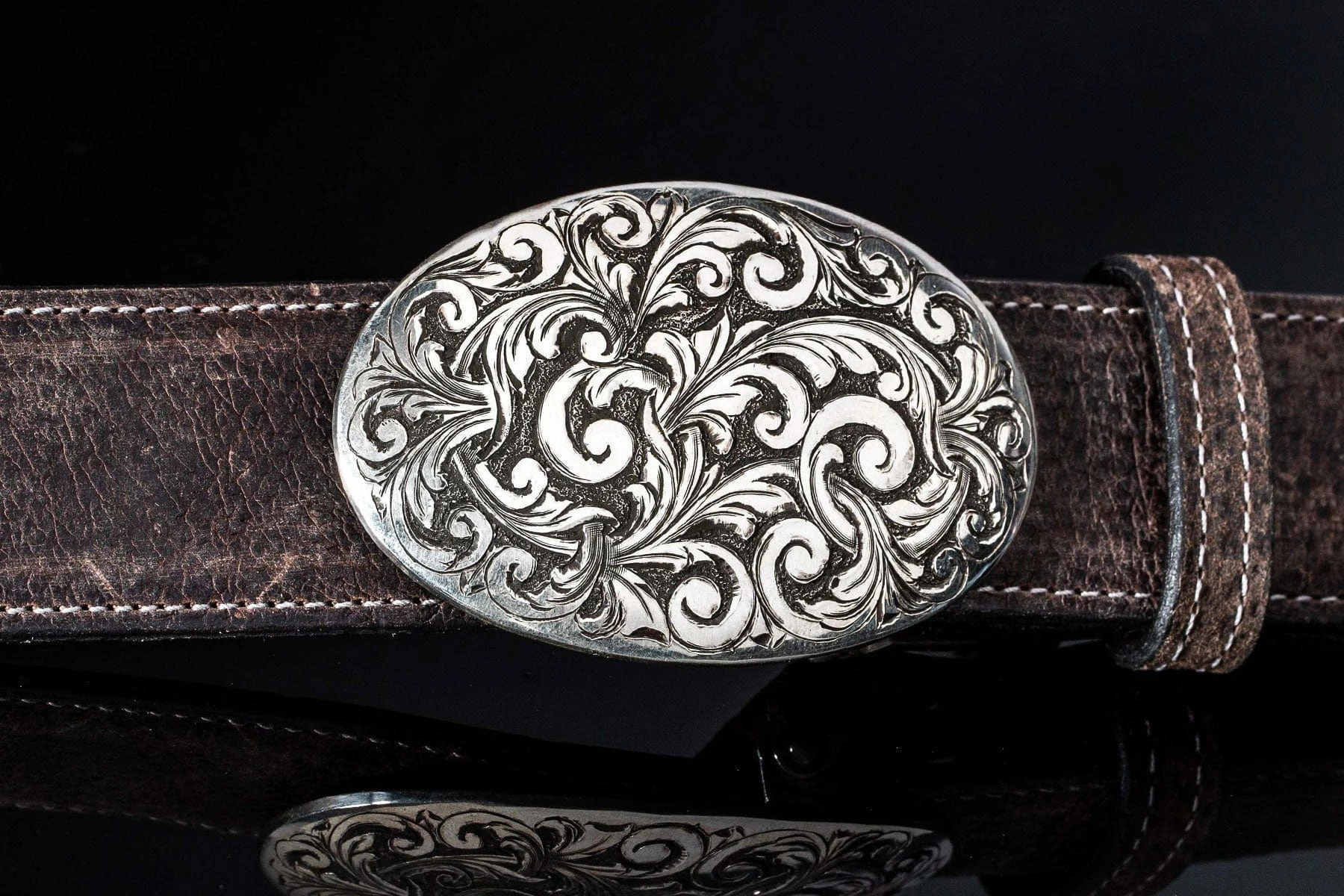 The Sutro Austin is a Sterling silver “Sutro” shape trophy style buckle with deep “Austin” Italian style engraving.