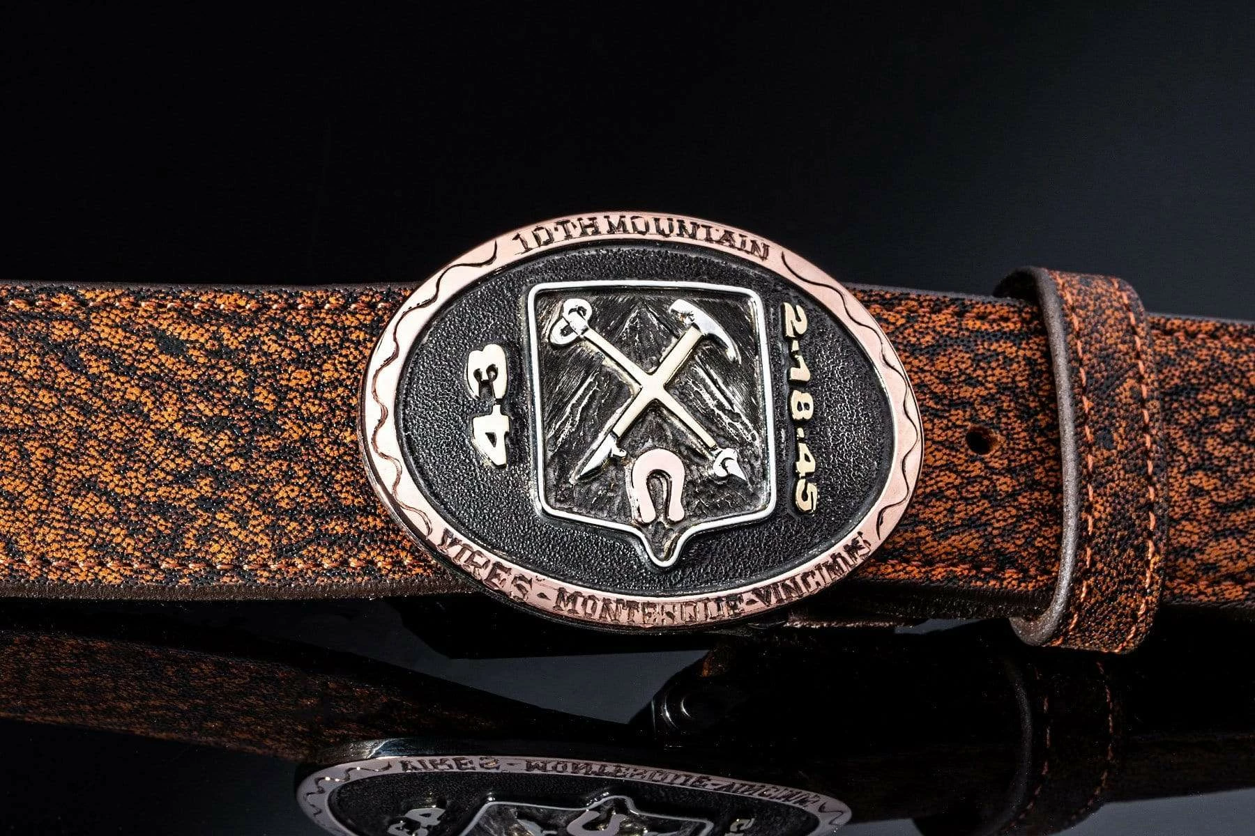 Comstock Heritage sterling silver buckle with 10th Mountain Division logo in the center. The border features 14 karat red gold. The gold 43 with the words CAMP HALE subtly engraved beside it, represents the year that the 10th Mountain Division started their training at Camp Hale. The gold 45 with the word ITALY engraved beside it refers to the year that the soldiers helped liberate northern Italy in WWII. Hand engraved by America’s oldest silversmith, Comstock Heritage. Buckle may be worn with all 30mm belt straps.