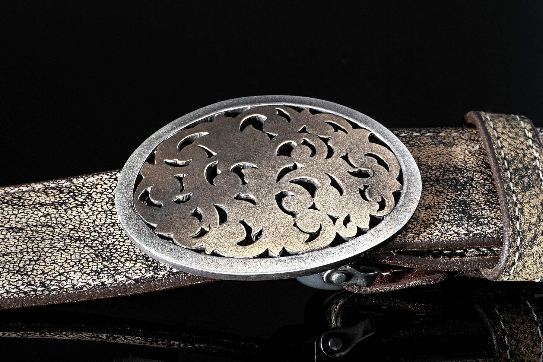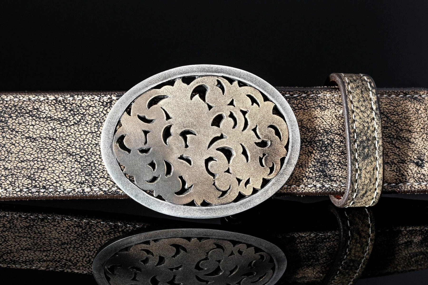 - Sterling silver oval “Sutro” shape buckle with inlaid cut-out gold
