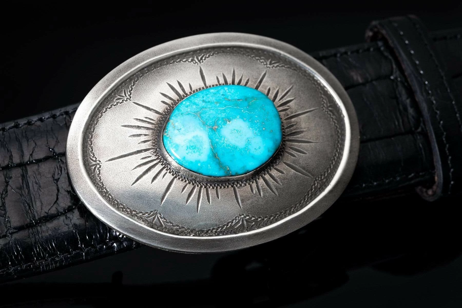 - Small oval engraved belt buckle with sterling silver flat wire edge