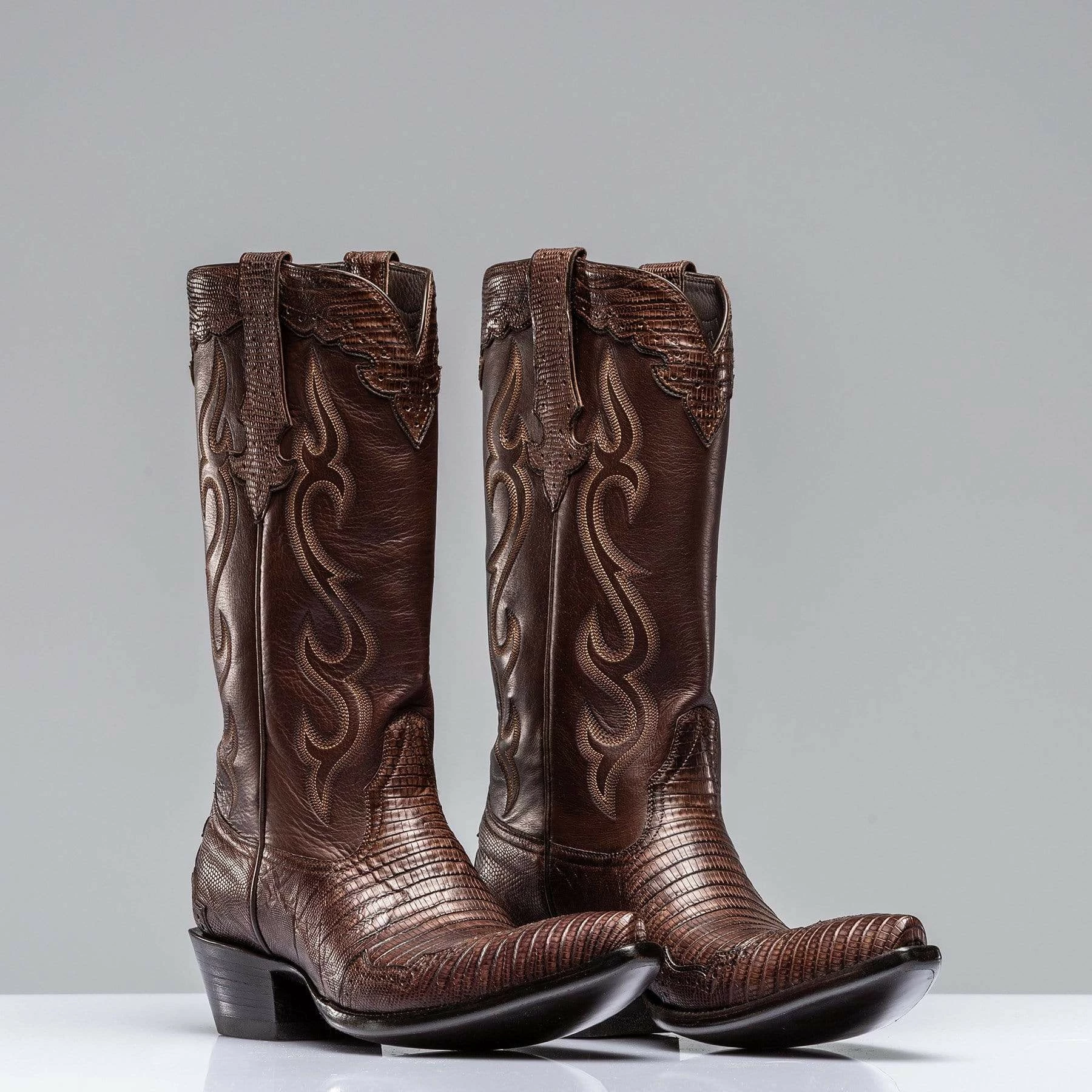 This handsome Majestic cowboy boot stands alone in its styling, richness of color, and versatility. The deep chocolate Teju lizard skin from Argentina is used on the vamp, collar, and pulls, and is also overlaid in a scalloped design on the wingtip and heel counter; a practice used not only for interest and beauty, but for added protection from wear and tear over the years. The chocolate calfskin uppers boast a classic flame pattern with eight rows of hand stitching in graduated hues of beige and browns. Each pair is handmade by artisans from Stallion Boot Company of El Paso, Texas with 30 or more years of experience.