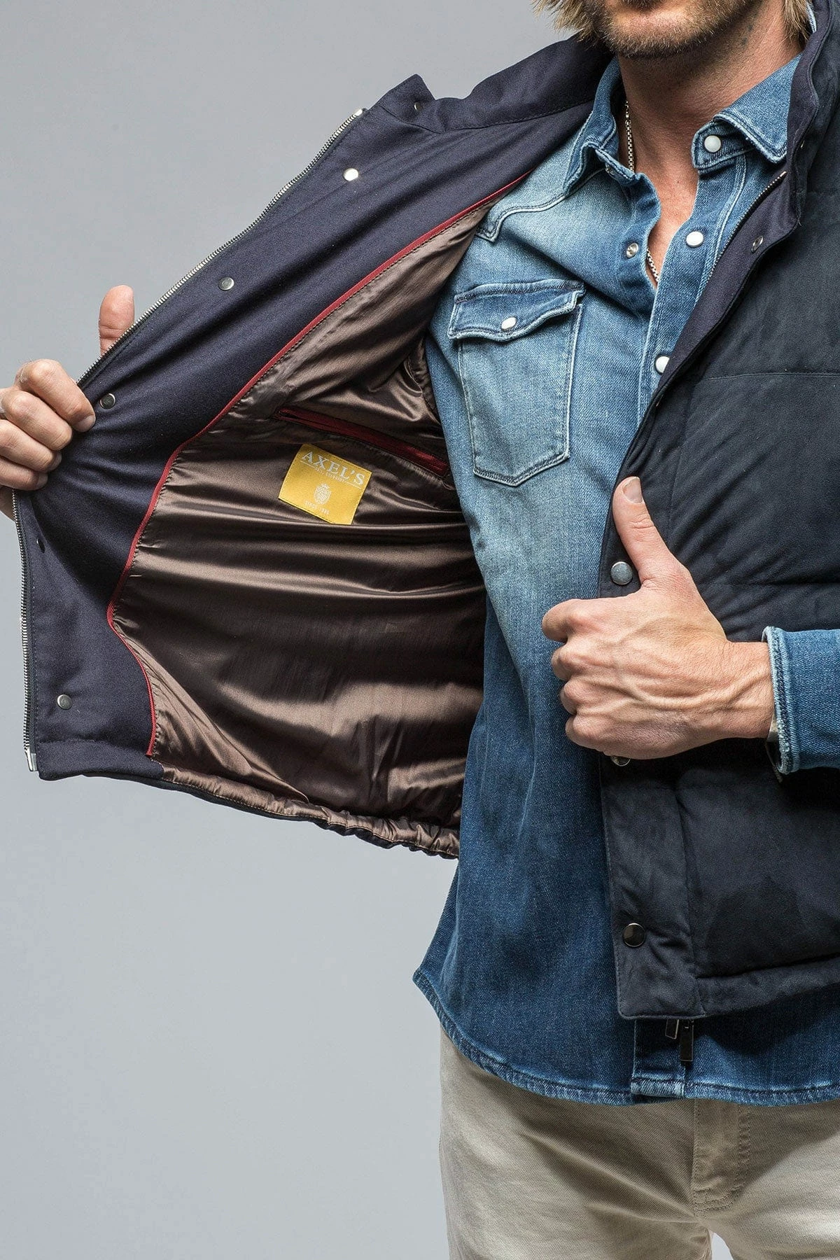 - Snap closure placket, hidden two-way directional zipper