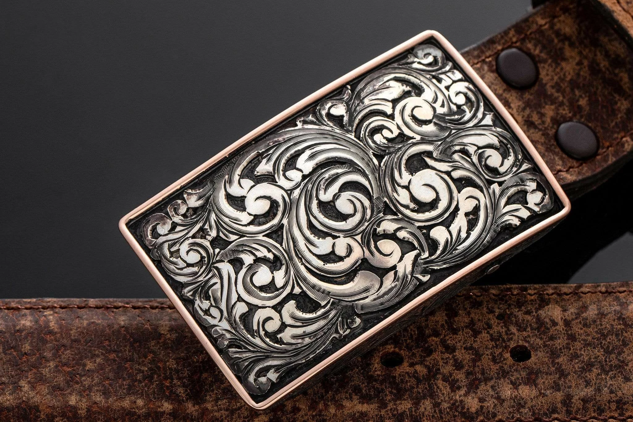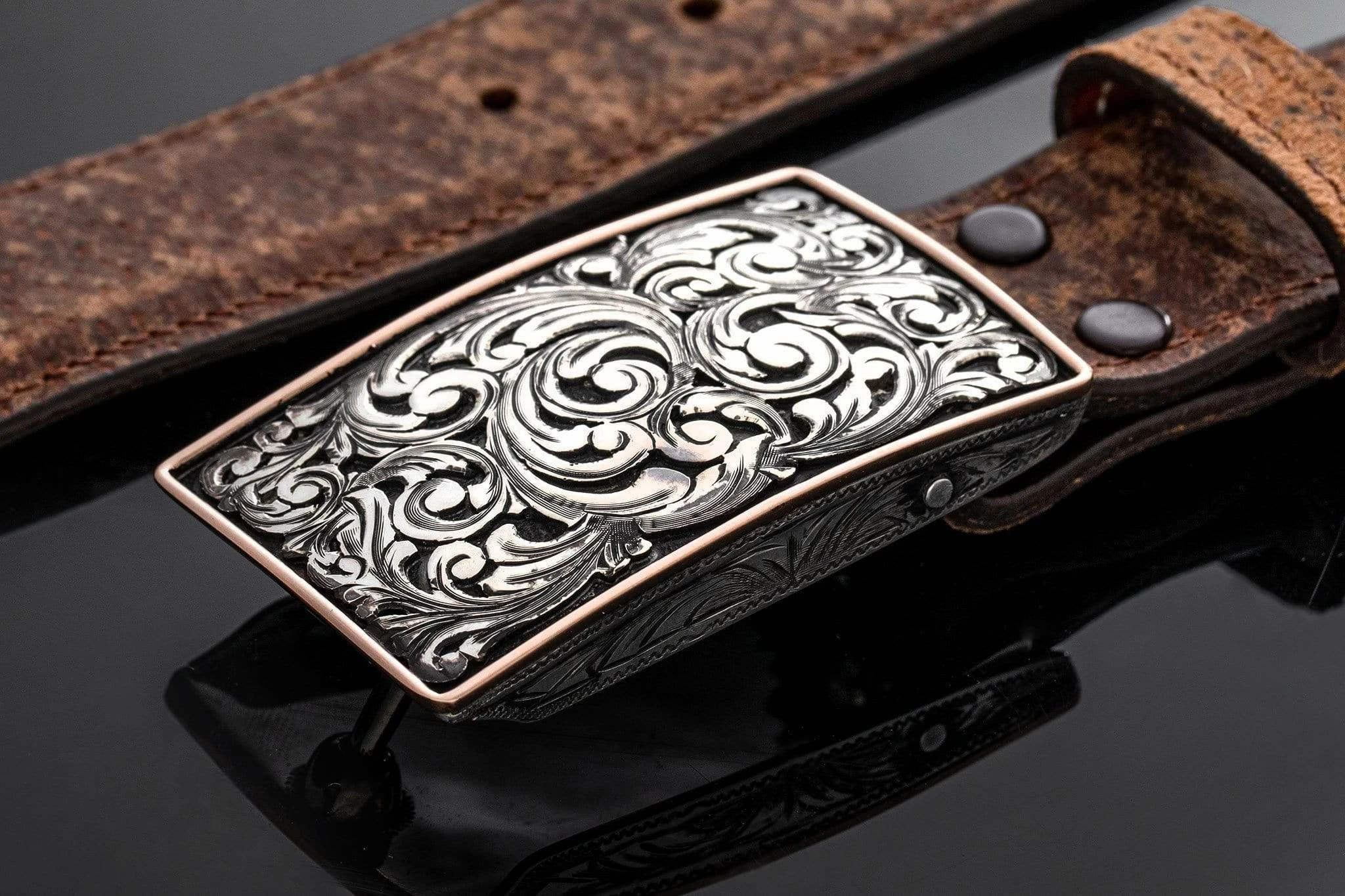 - Hand-engraved and lightly antiqued 14k sterling silver scroll overlays.