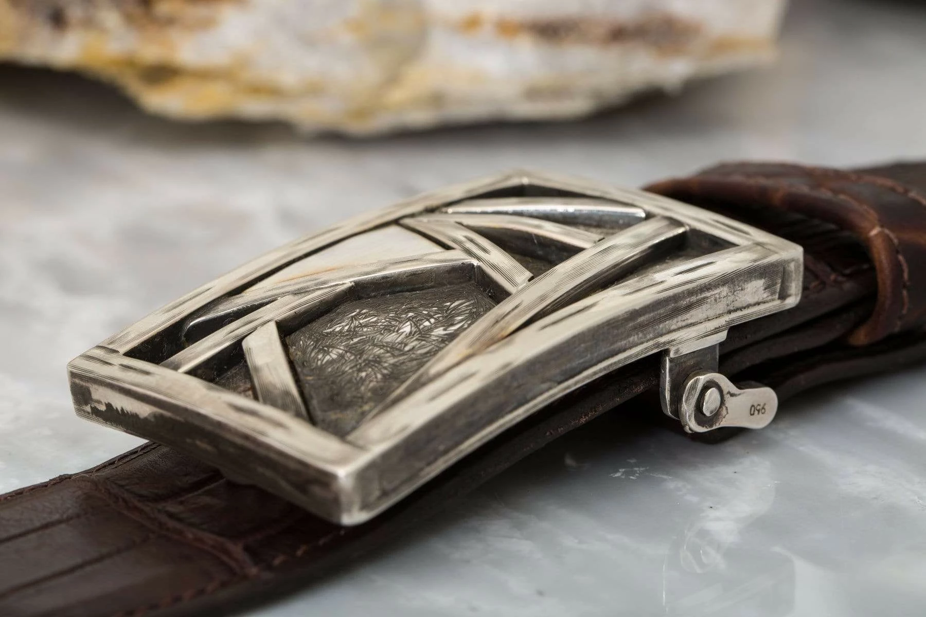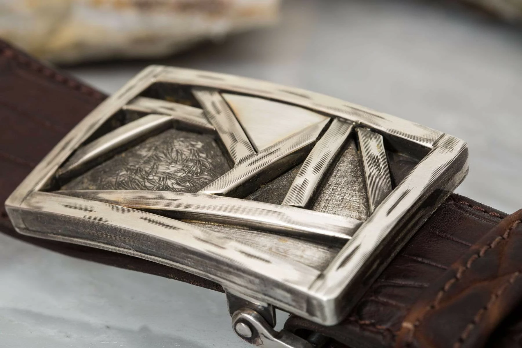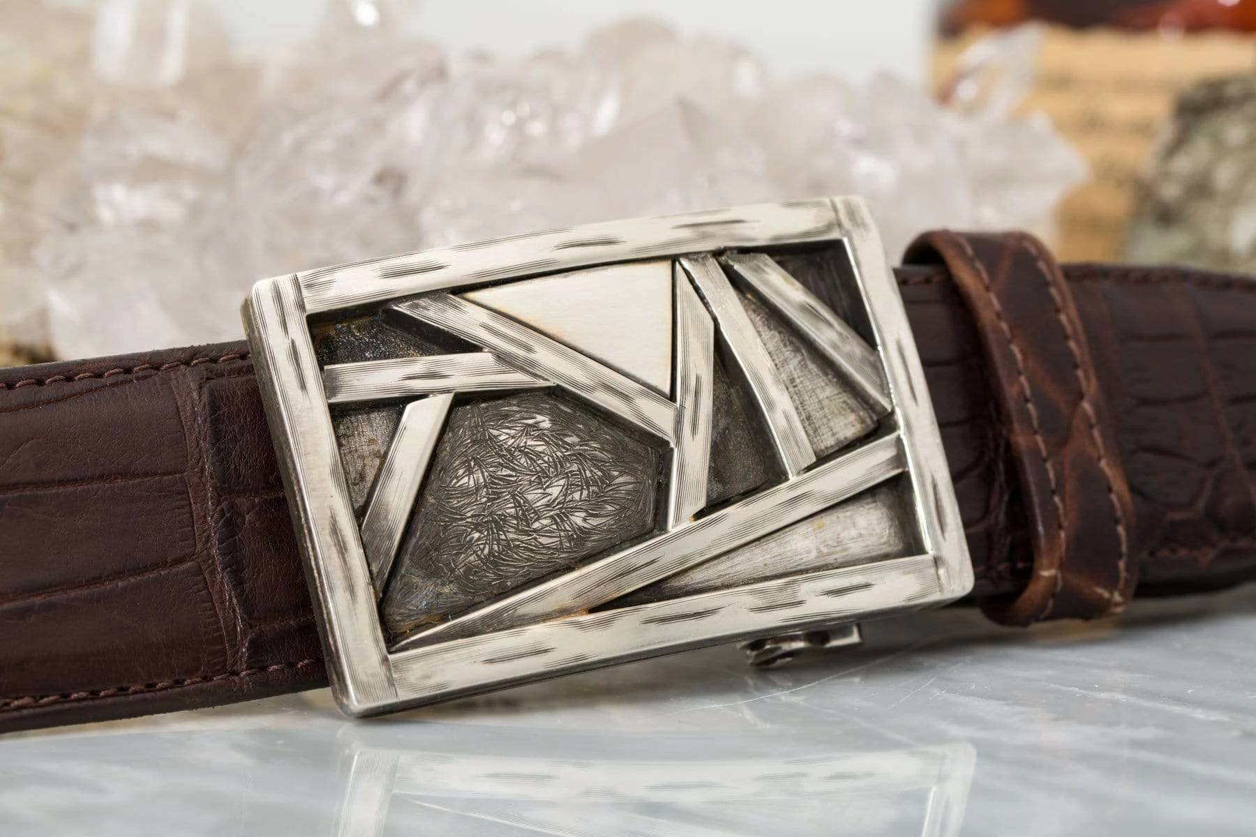 The Tyson Cornerstone buckle by Comstock Heritage features layered inlays of sterling silver set in a weighty framework of sterling silver bars. Varying styles and degrees of engraving work (all done by hand) create a certain avant garde architecture, which is handsomely tempered by the heavily oxidized coloration and geometric framing. Fits all 1.5 inch belts.
