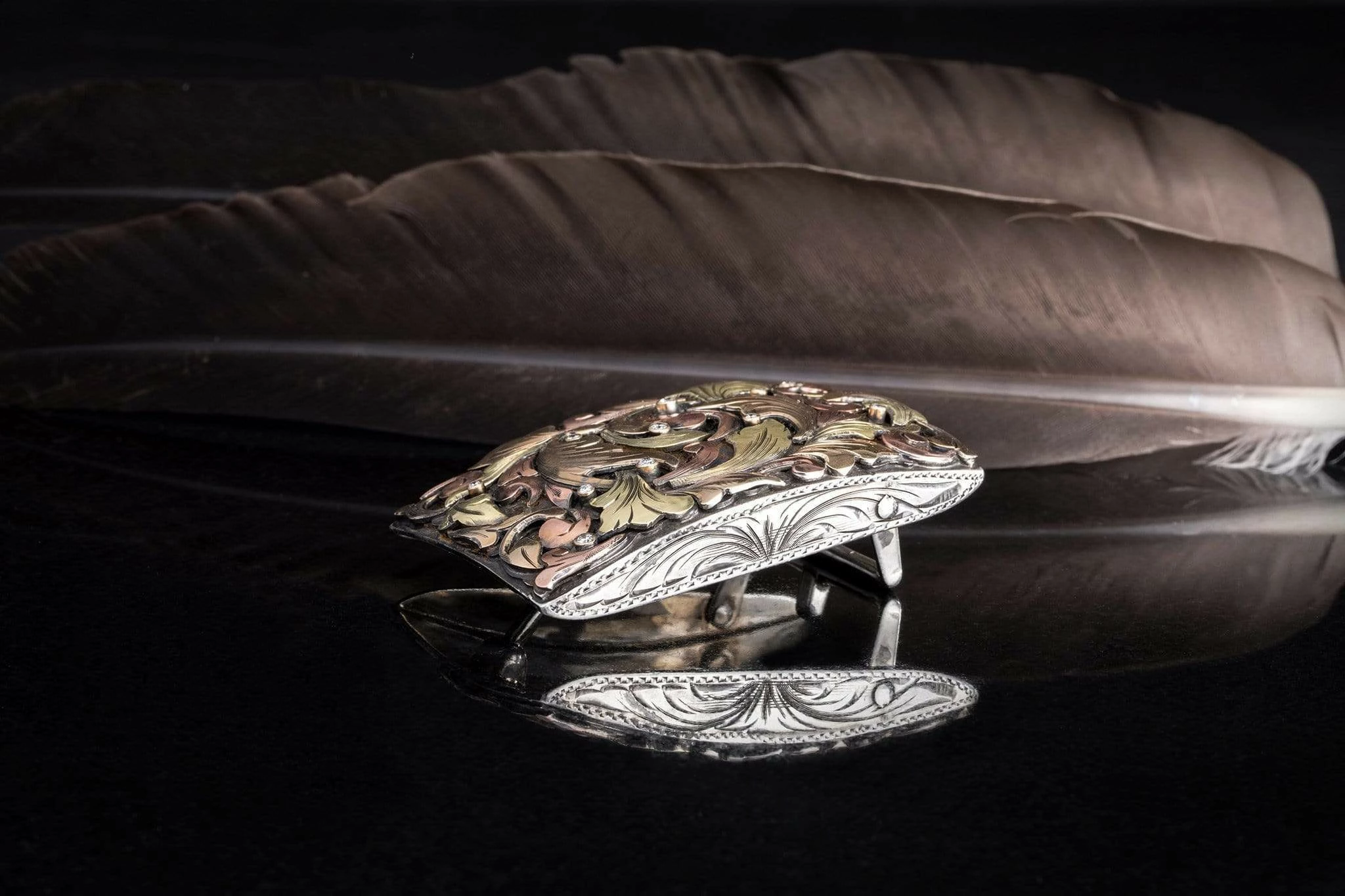 - There is a delicate harmony in the pattern’s asymmetrical flow, with denser arrangement near the edges forming a border which highlights the beguiling sense of motion at the buckle’s center