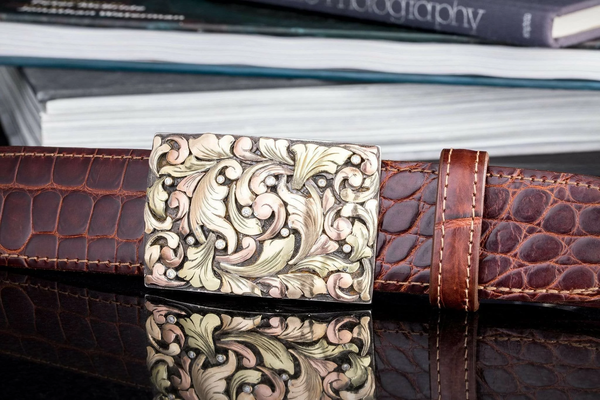 - Floral scrollwork comprising 18k green gold, 14k yellow gold, 14k rose gold, and eleven white diamonds set in gold bezels.