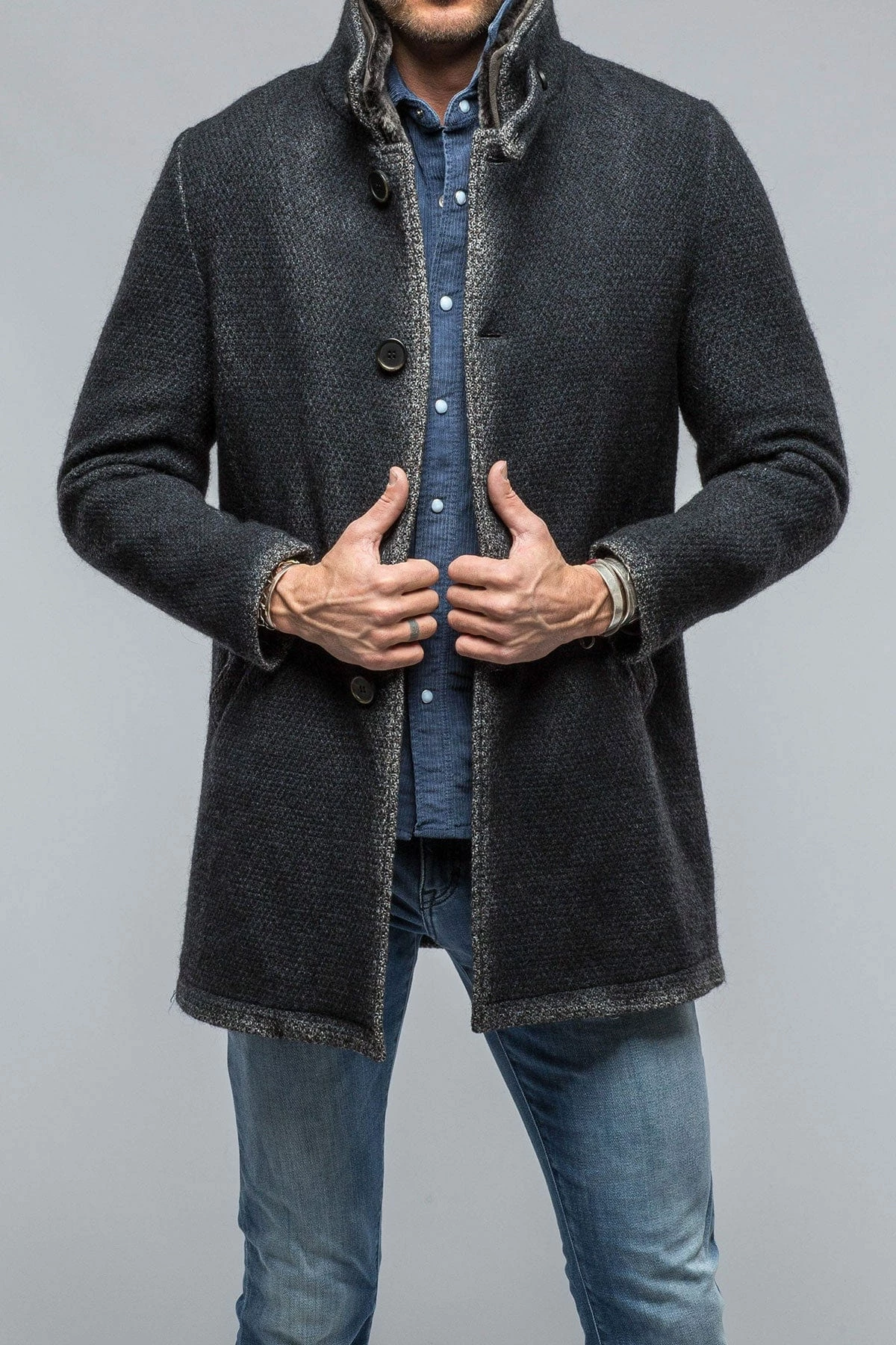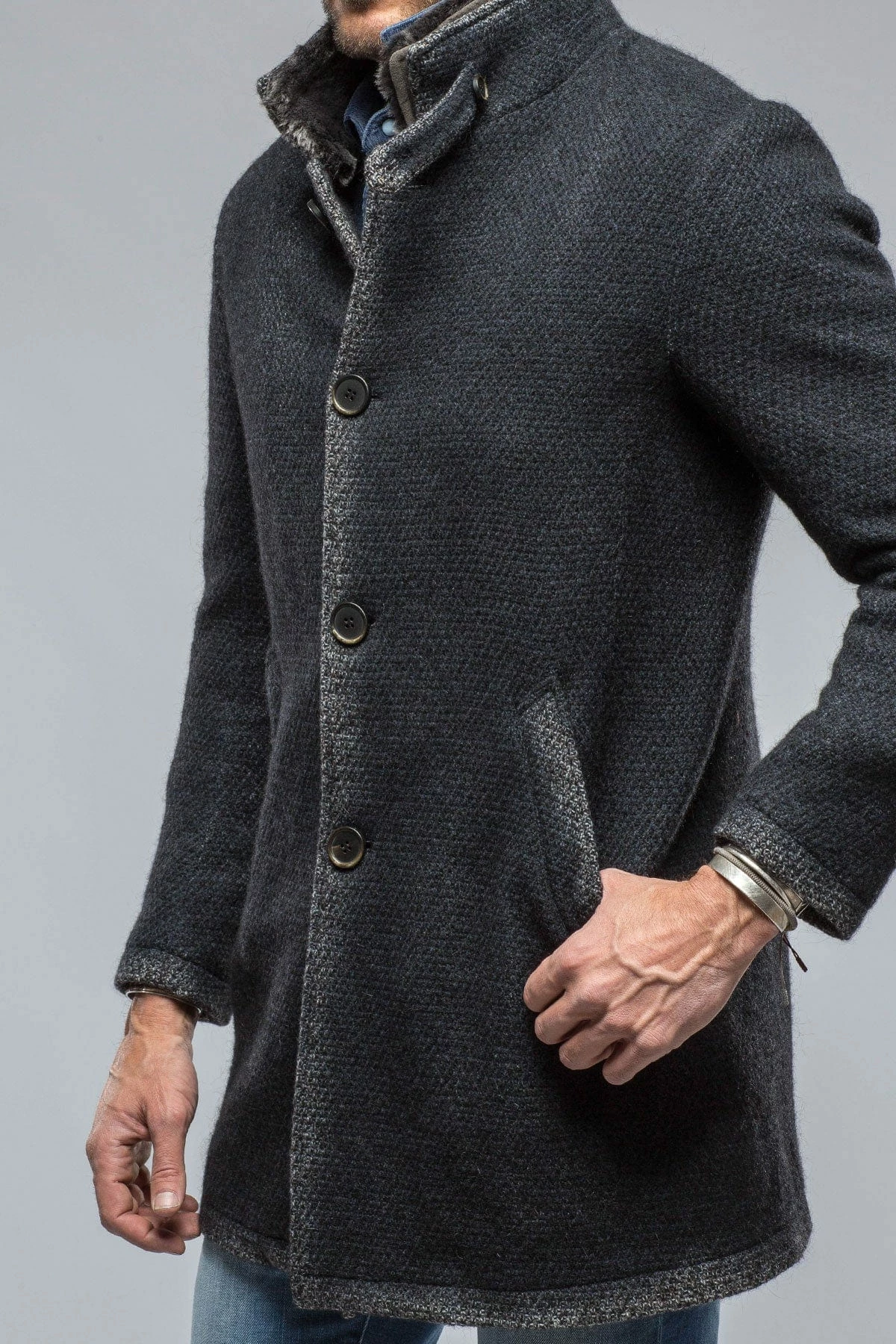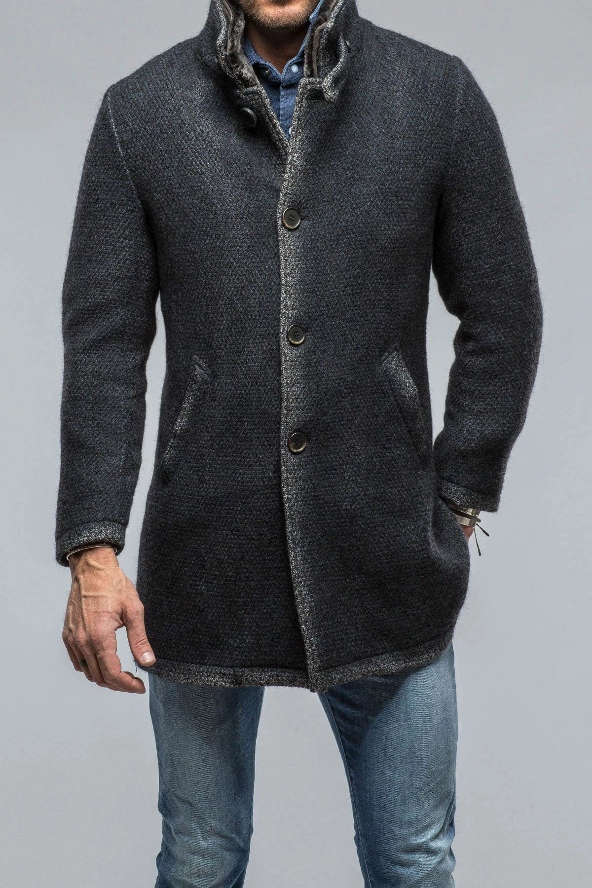 The Winston was made for Axel’s by Gimo’s with a wool-mohair blend knit. Thick, well-textured fabric that registers definitively as a coat, with a sweater’s softness and stretch. Lined in deliciously soft synthetic fur fleece, The Winston is a smart and approachable style sure to be complimented for seasons to come.